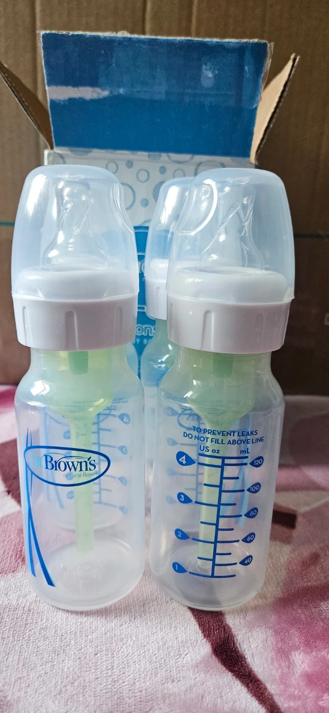 Dr. Brown's Anti-Colic Options+ Narrow Baby Bottles come in a 4 oz (120 ml) 4-pack. These BPA-free bottles are designed to prevent leaks. Includes bottle instructions and cleaning brushes.