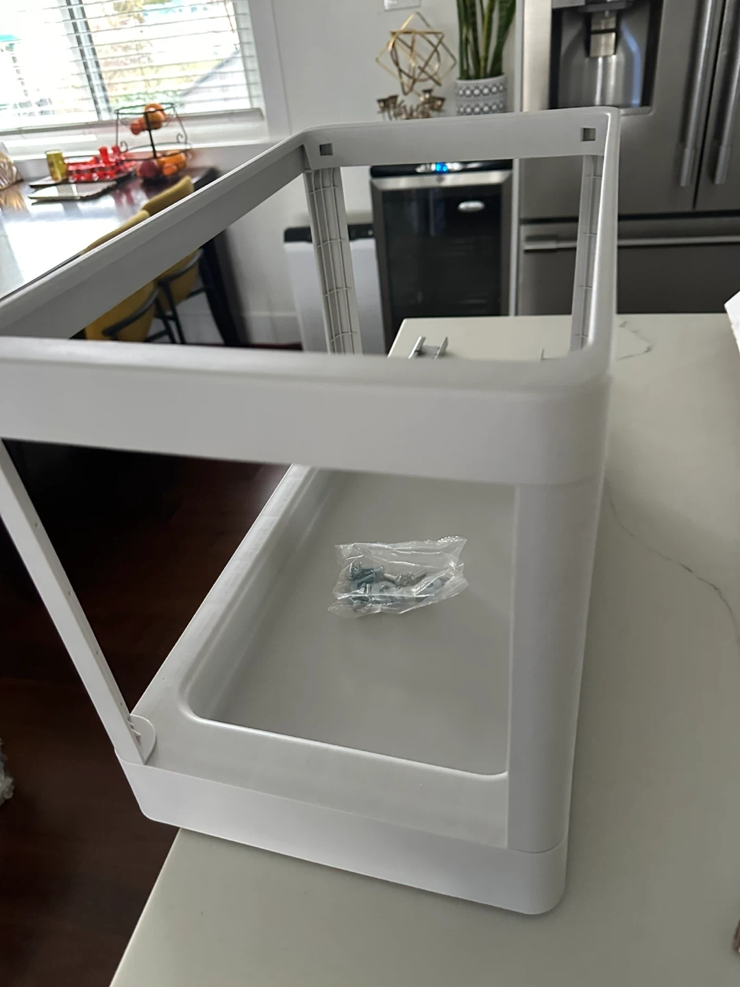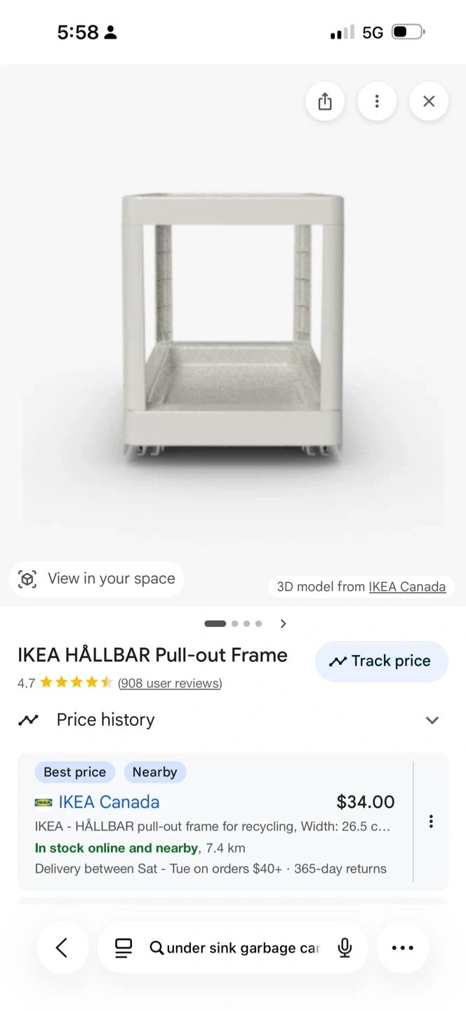 This is the IKEA HÄLLBAR pull-out frame, perfect for organizing your kitchen or under-sink space. It's designed for easy access to recycling bins or trash cans. The frame is white and includes the necessary screws for assembly.