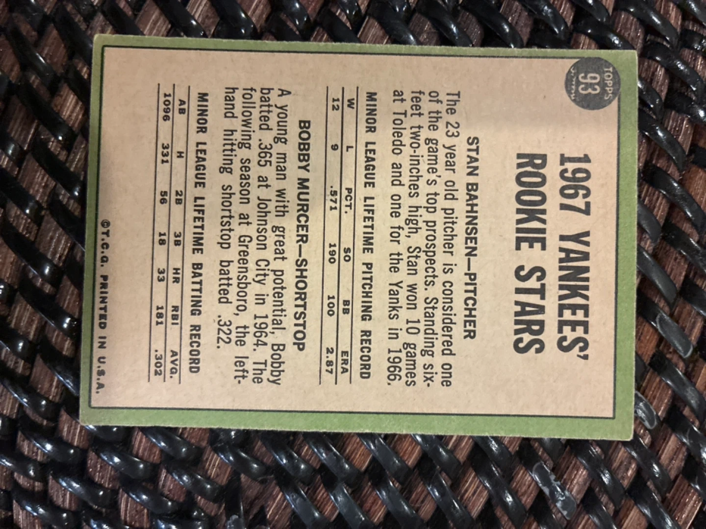 This is a vintage 1967 Topps New York Yankees rookie baseball card featuring shortstop Bobby Murcer and pitcher Stan Bahnsen. Rookie cards are very collectible. The card includes player statistics and biographical information.
