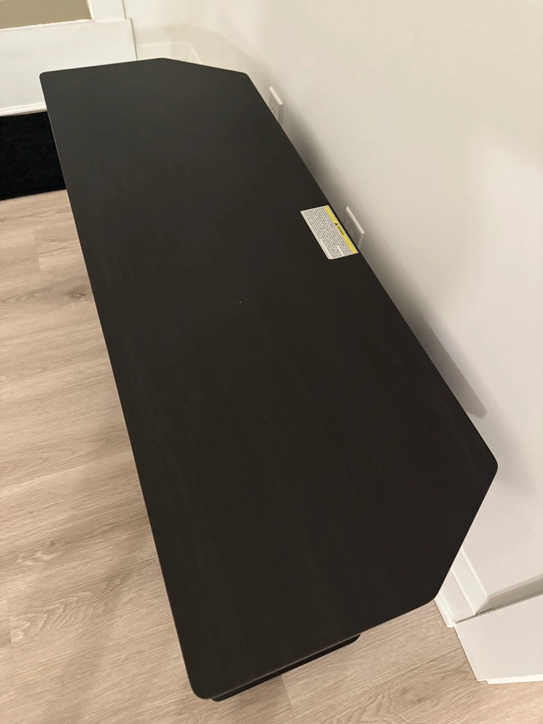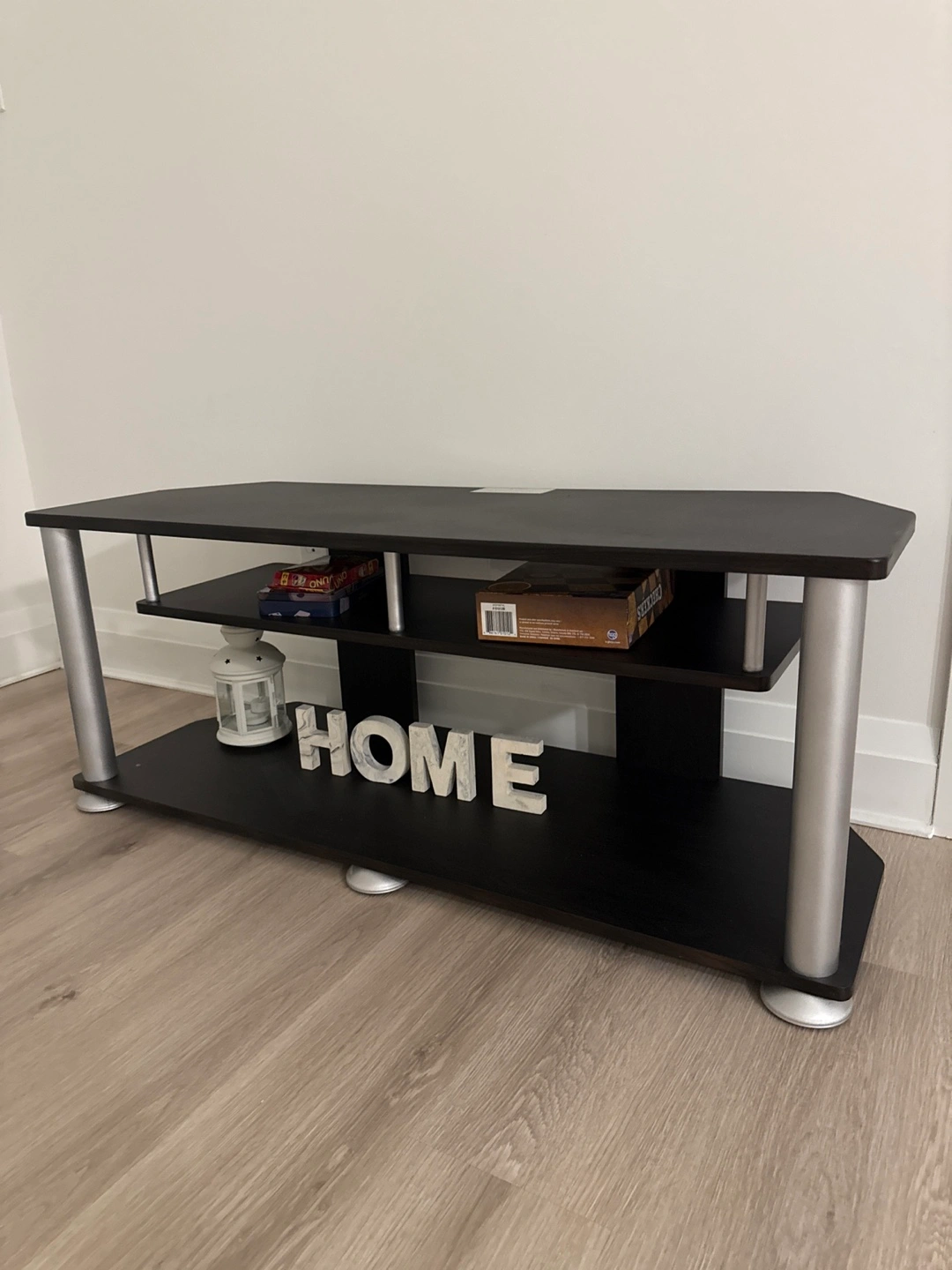 Contemporary TV stand. Black finish. Silver coloured legs. Three shelves. Approximately 43 inches wide and 16 inches deep.