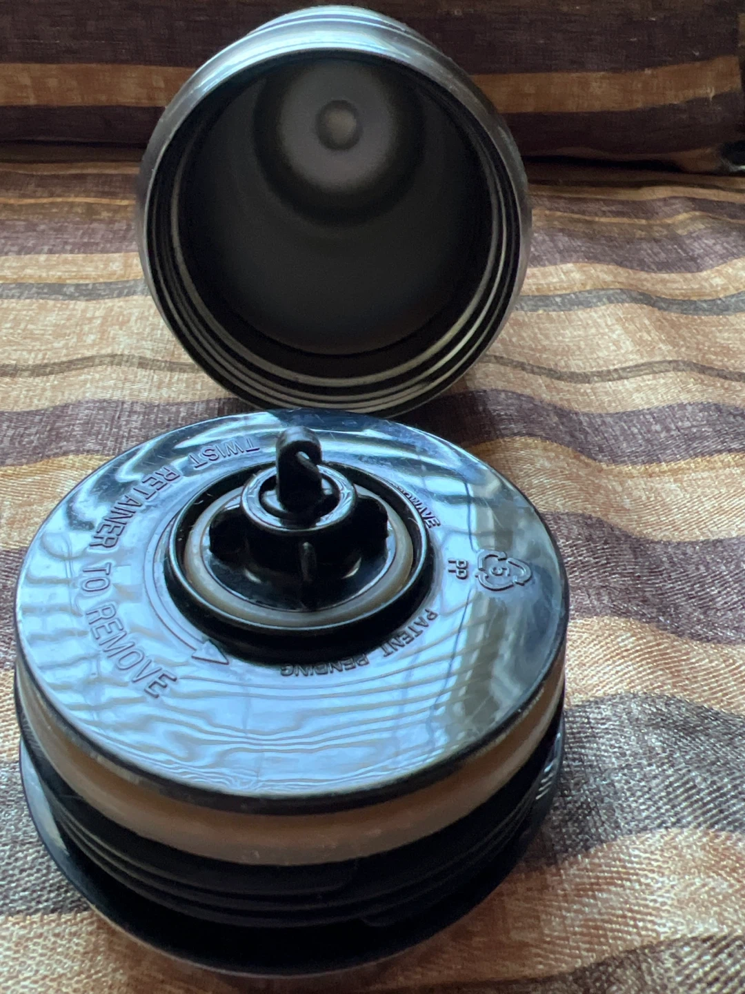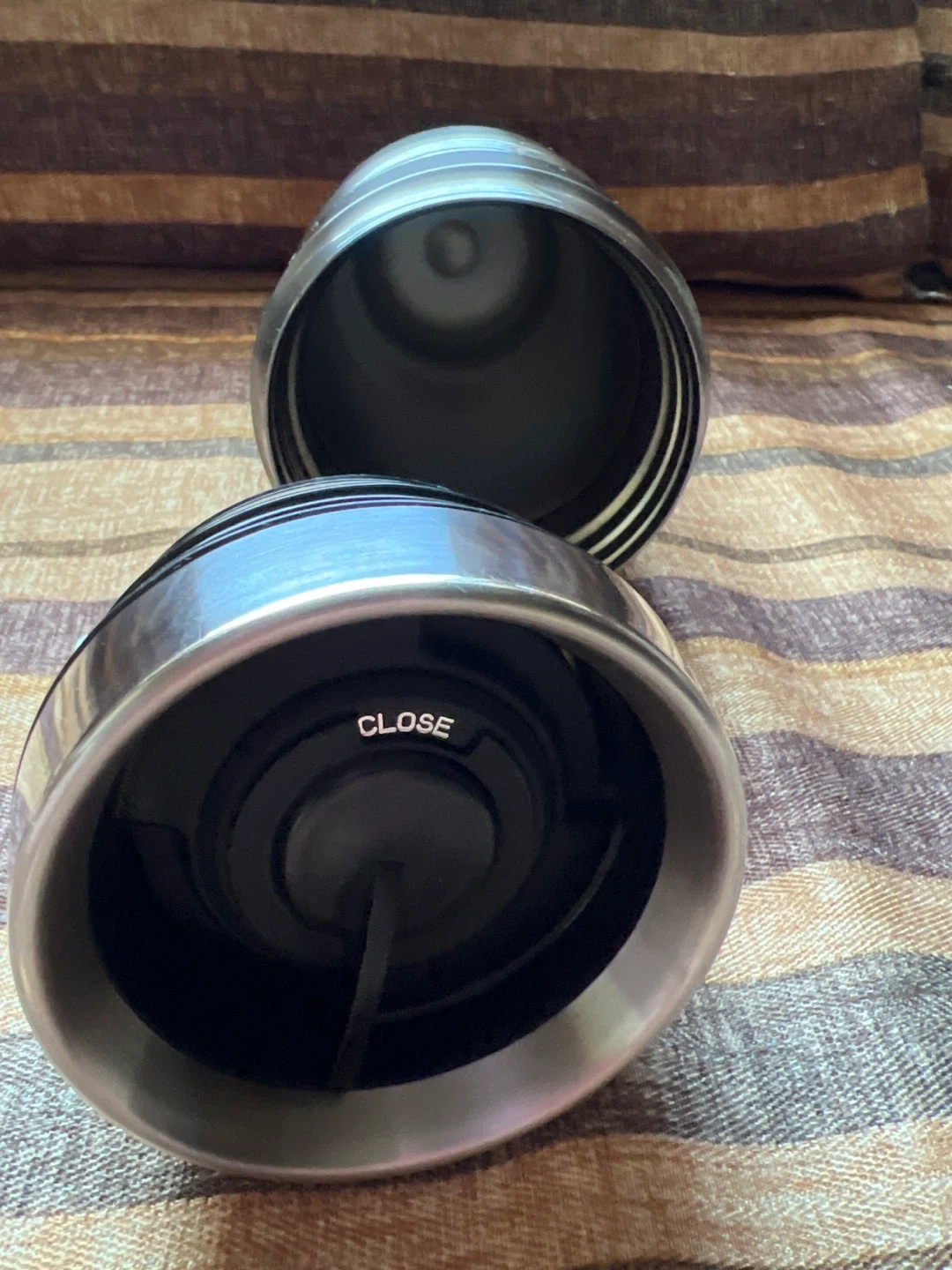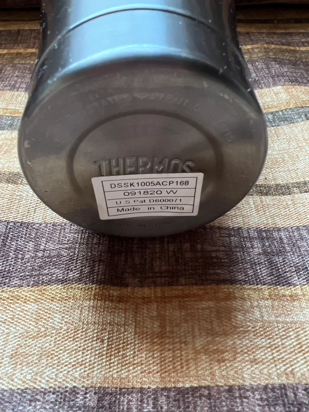 Thermos stainless steel travel tumbler. Model DSSK1005ACP168. Features a twist-open lid with a secure seal. Made in China.
