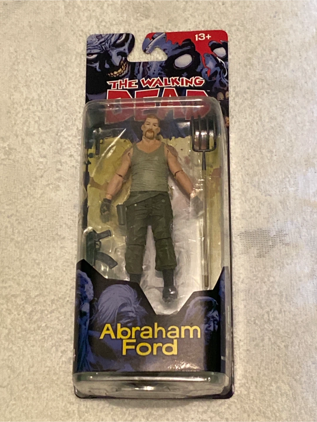 Set of four collectible action figures from The Walking Dead series. Includes Carl Grimes, Abraham Ford, Paul "Jesus" Monroe, and a Pin Cushion Zombie. Each figure is in its original packaging and suitable for ages 13+.