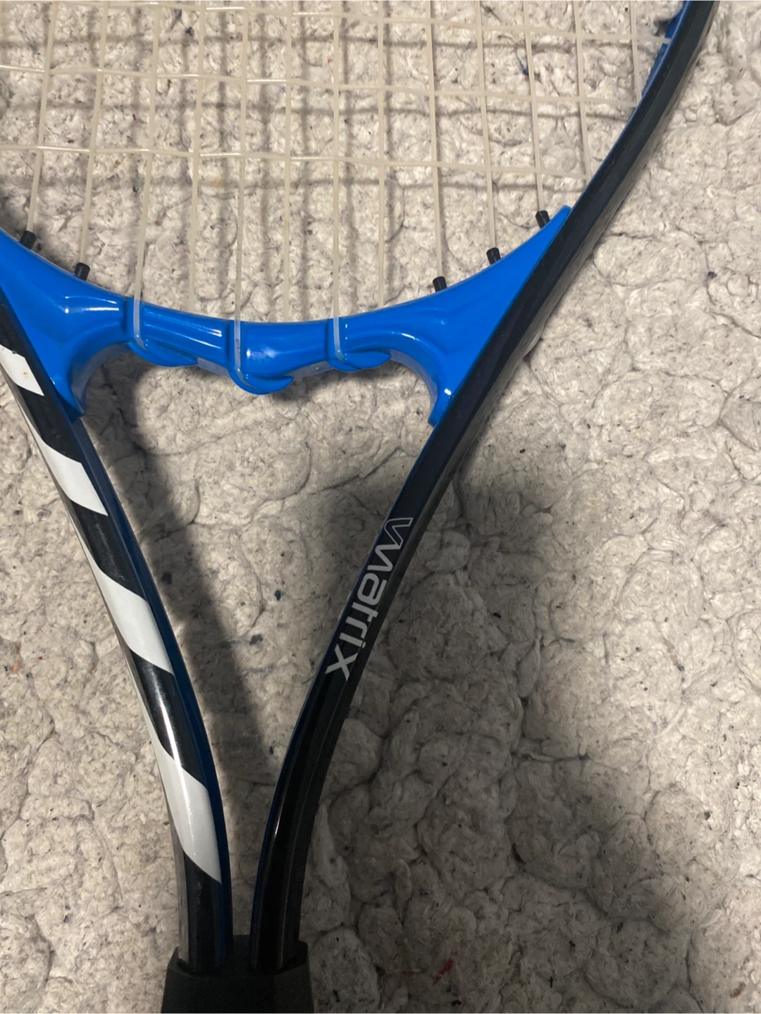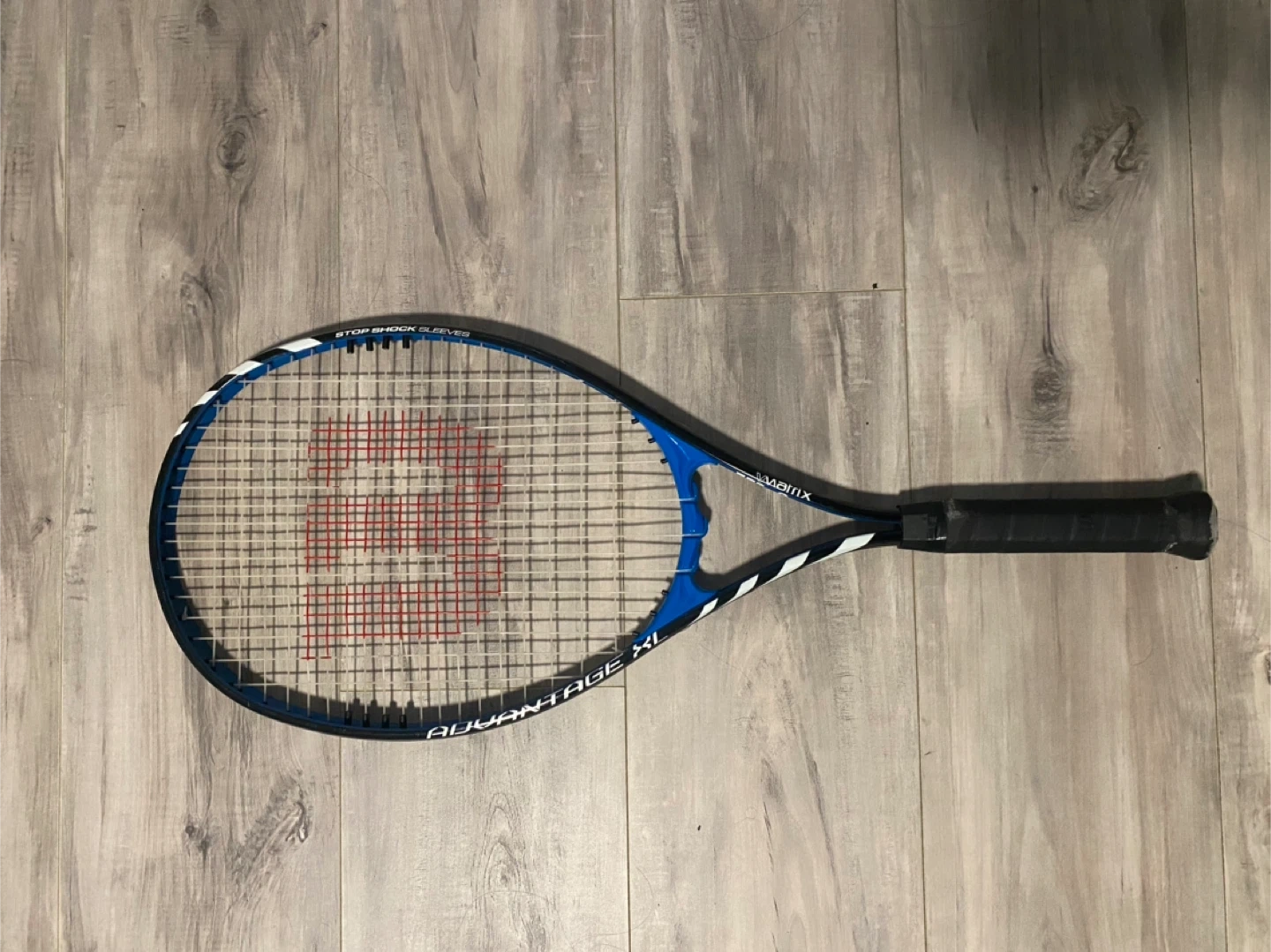 Wilson Advantage XL tennis racquet with Matrix technology. Features a blue and black frame with white accents. It has stop shock sleeves for vibration dampening. This racquet is ready for the court!