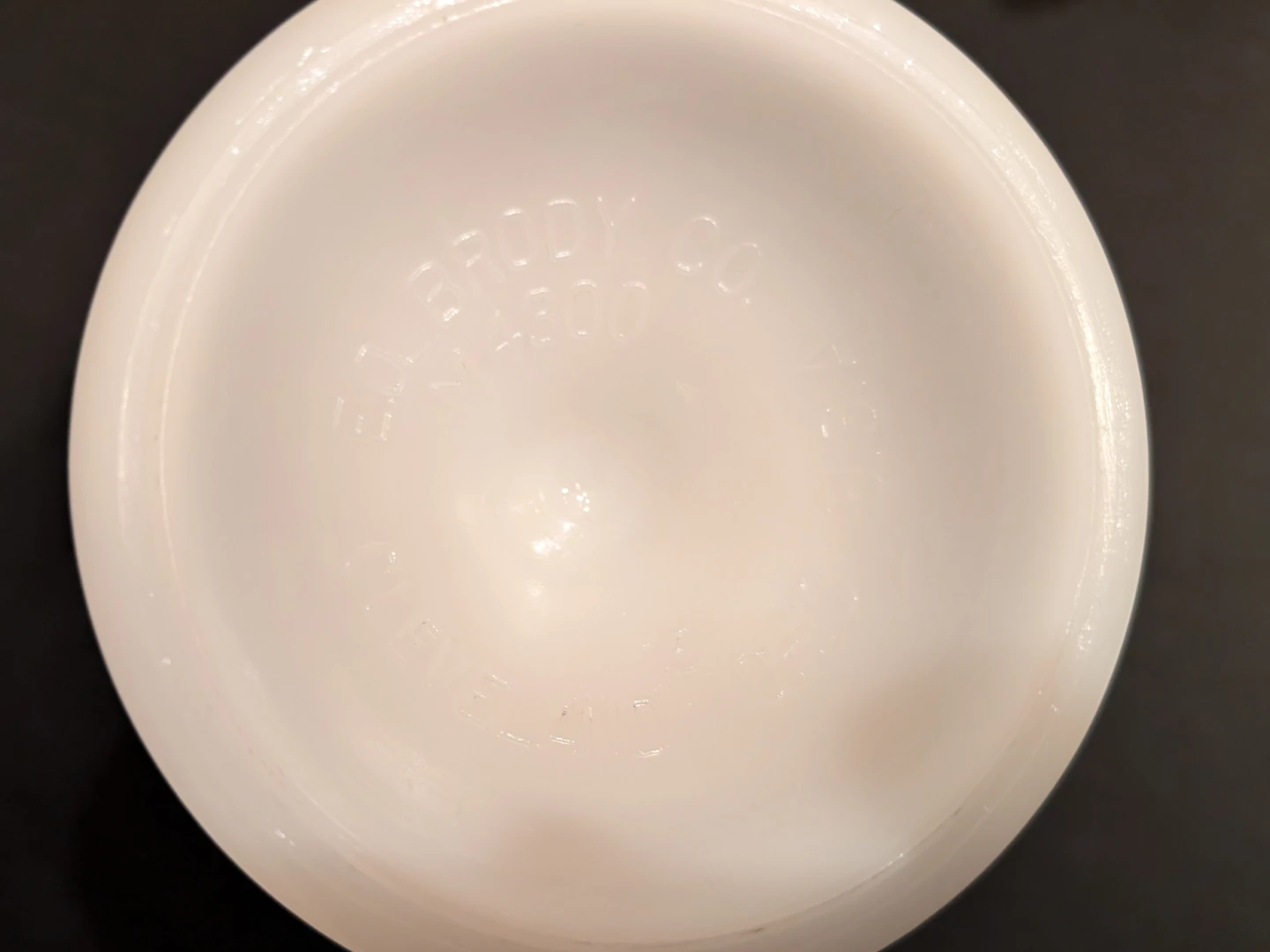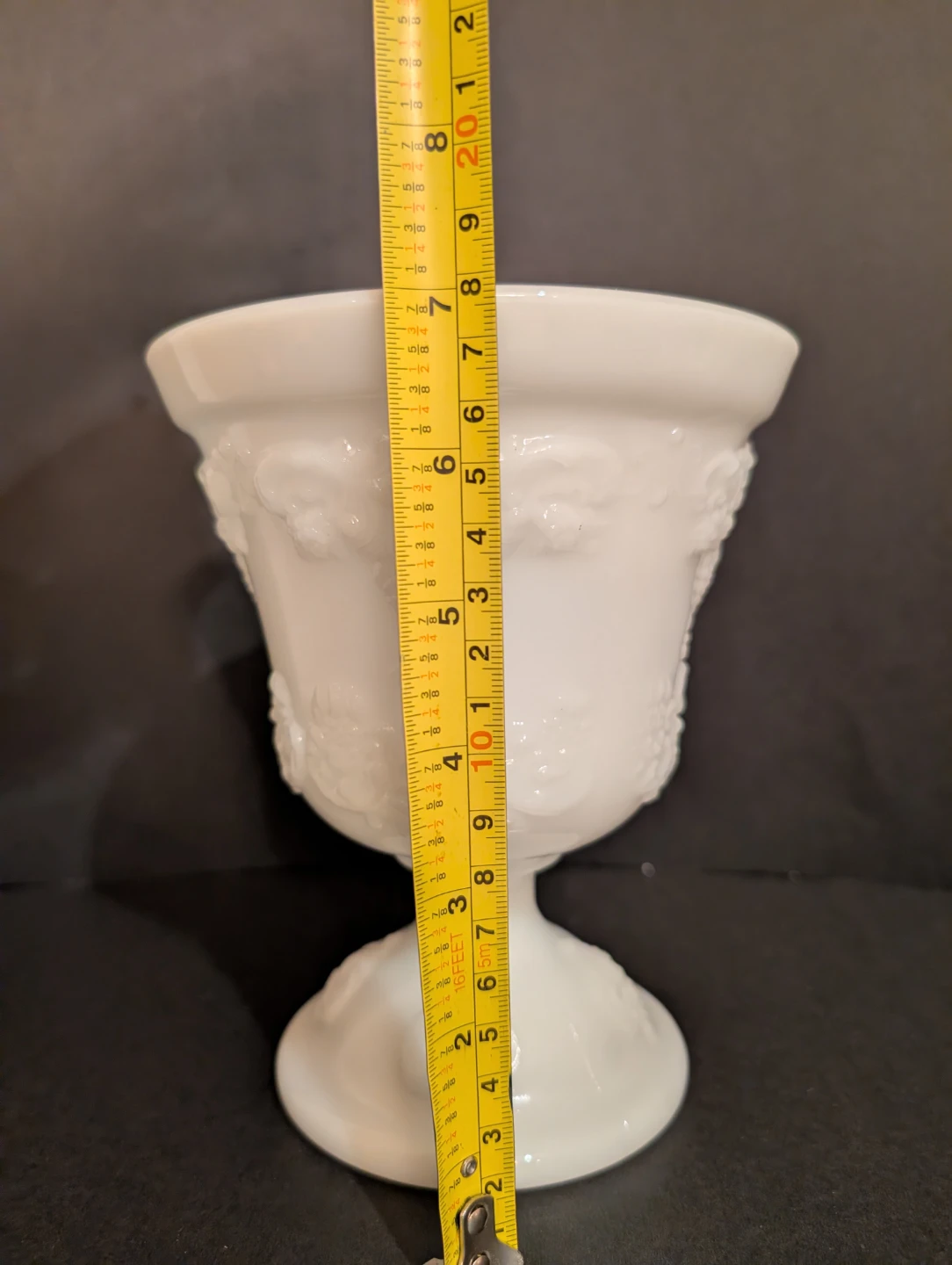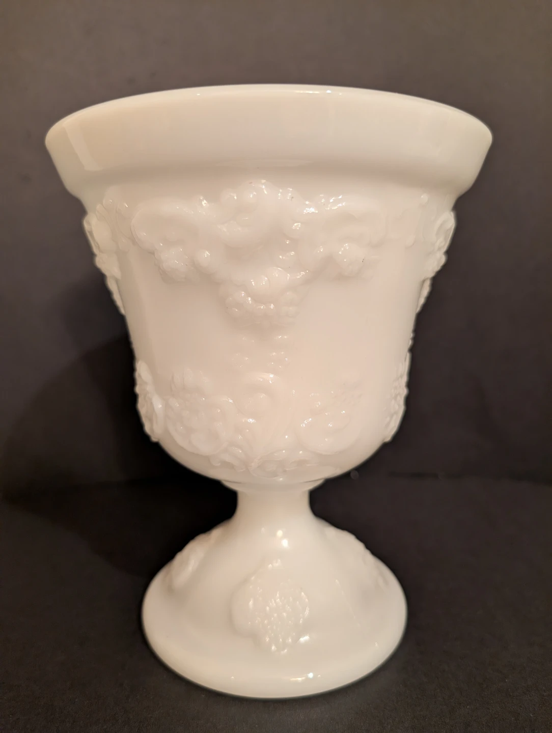 This is a lovely EO Brody Co. milk glass pedestal vase. It's decorated with an embossed grapevine pattern. It can also be great as a planter or compote dish. It measures approximately 7 inches tall and 5.75 inches in diameter. No chips, no cracks, it's in gorgeous shape.