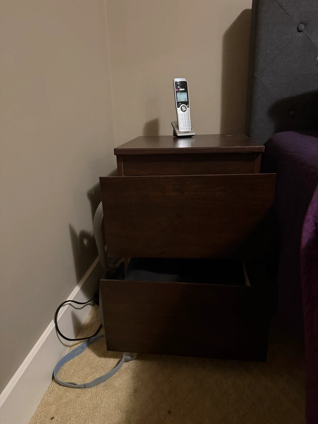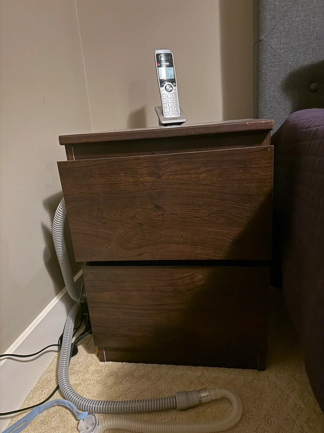 A dark wood nightstand featuring two drawers for storage. It's a practical bedside table, perfect for keeping essentials close. The wood finish complements most bedroom decors.