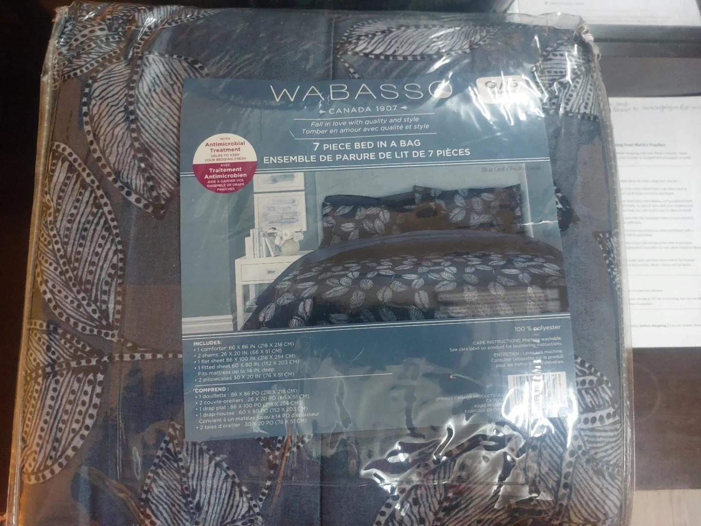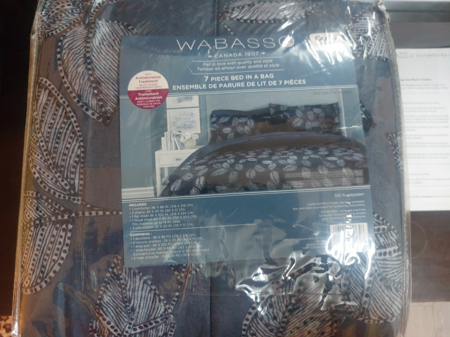 Brand new Wabasso 7-piece bed in a bag set. It includes 2 pillow shams, 2 decorative pillows, 1 fitted sheet, 1 flat sheet, and 1 duvet cover. The set is made from 100% polyester and features an antimicrobial treatment.