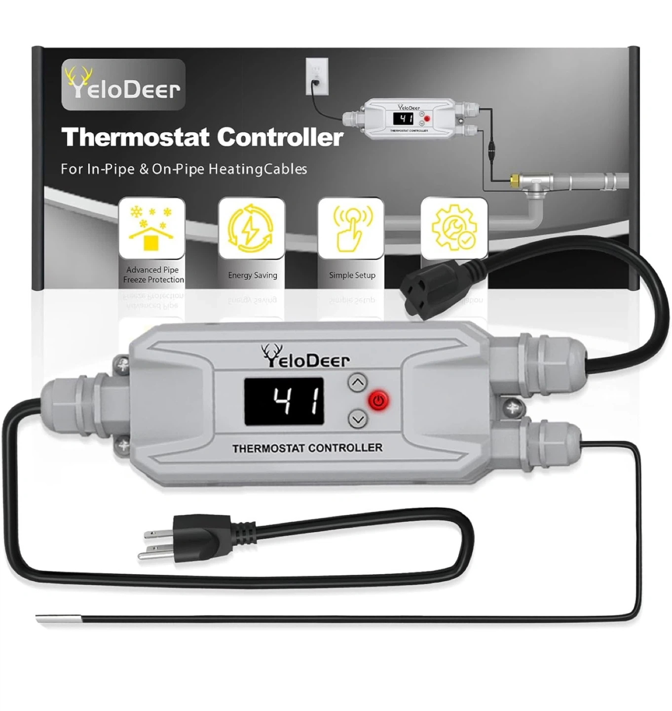 This YeloDeer thermostat controller is designed for in-pipe and on-pipe heating cables. It features advanced pipe freeze protection, energy saving capabilities, and simple setup. The temperature control range is 36°F to 86°F, and it has a sensor range of -4°F to 122°F. This unit has a 3ft power cord and a 15ft sensor.