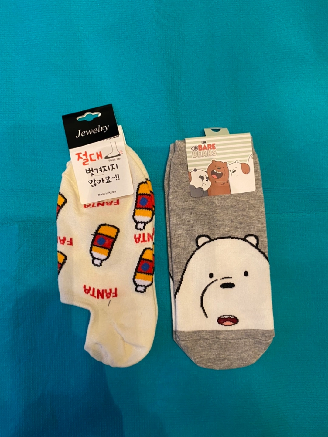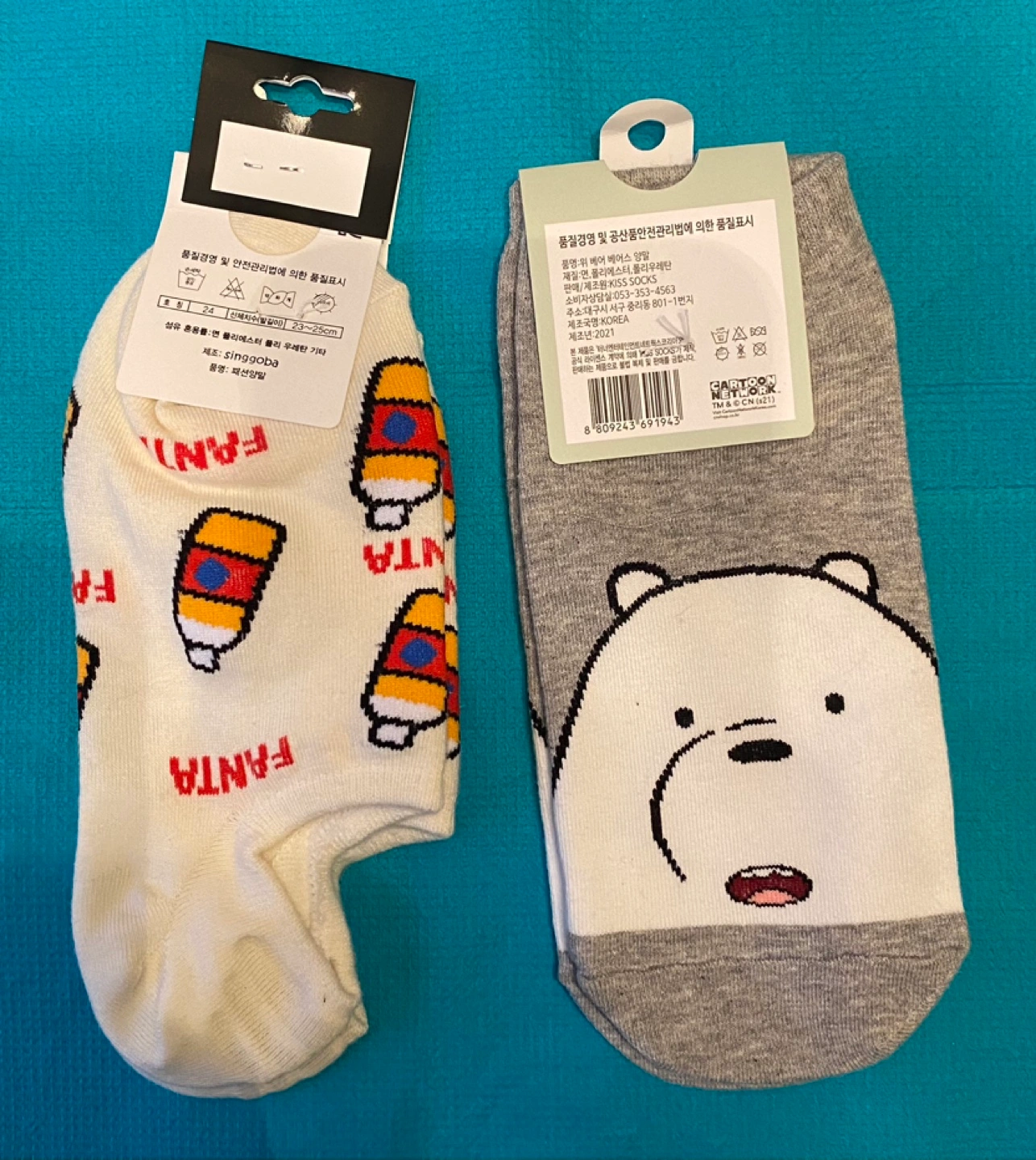 Pair of socks with We Bare Bears designs. One sock has a Fanta design, the other has a bear face. Made in Korea.