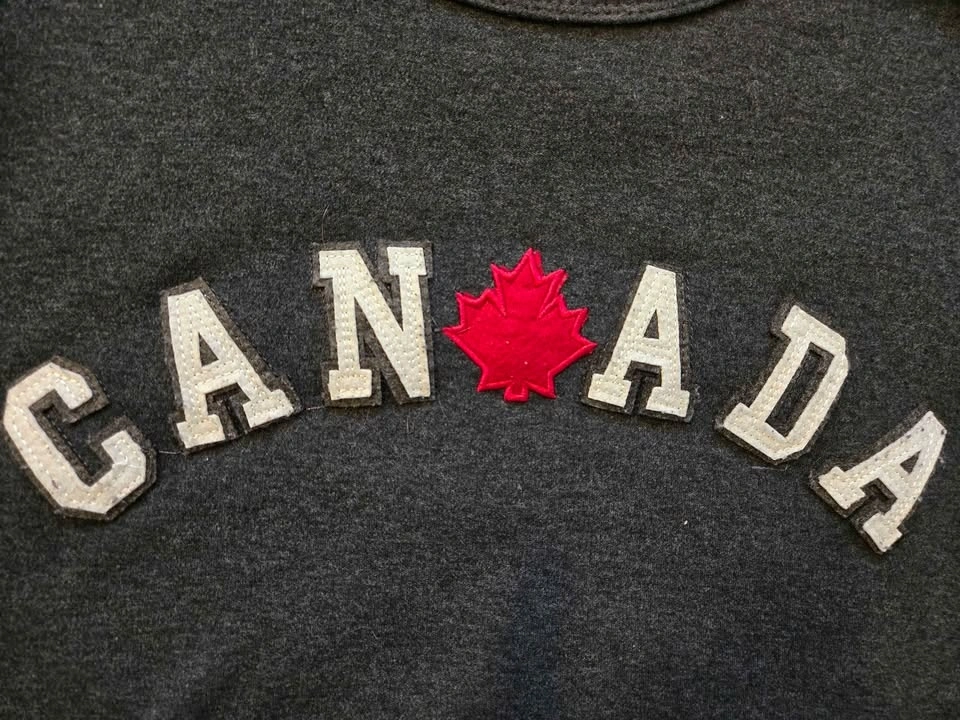 Soft, dark grey knit fabric and a crew neck. Contrasting red stitching on sides, shoulders, and top of sleeves.