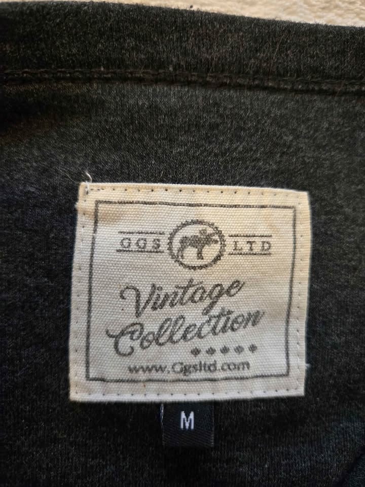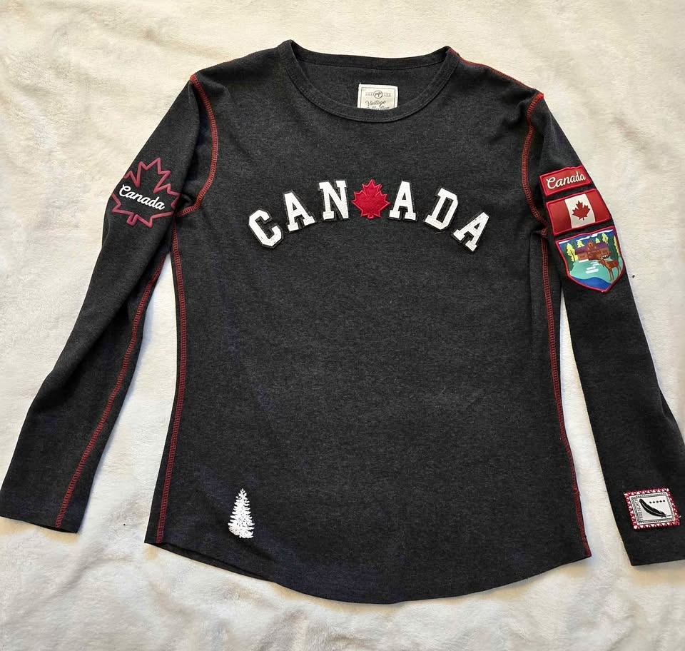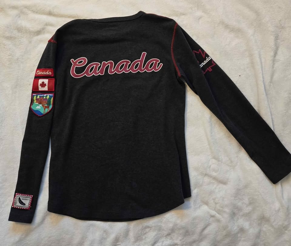 Soft, dark grey knit fabric and a crew neck. Contrasting red stitching on sides, shoulders, and top of sleeves.