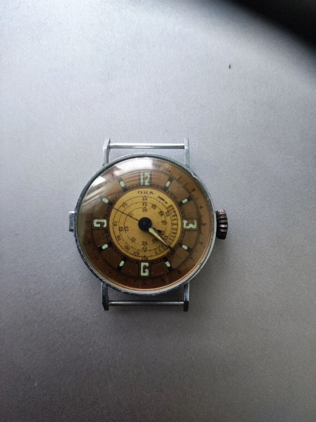 This is a vintage ORA wristwatch. It features a unique dial with inner and outer rings for tracking various measurements. The watch has a metallic case and a ribbed crown. It's a neat piece for collectors!
