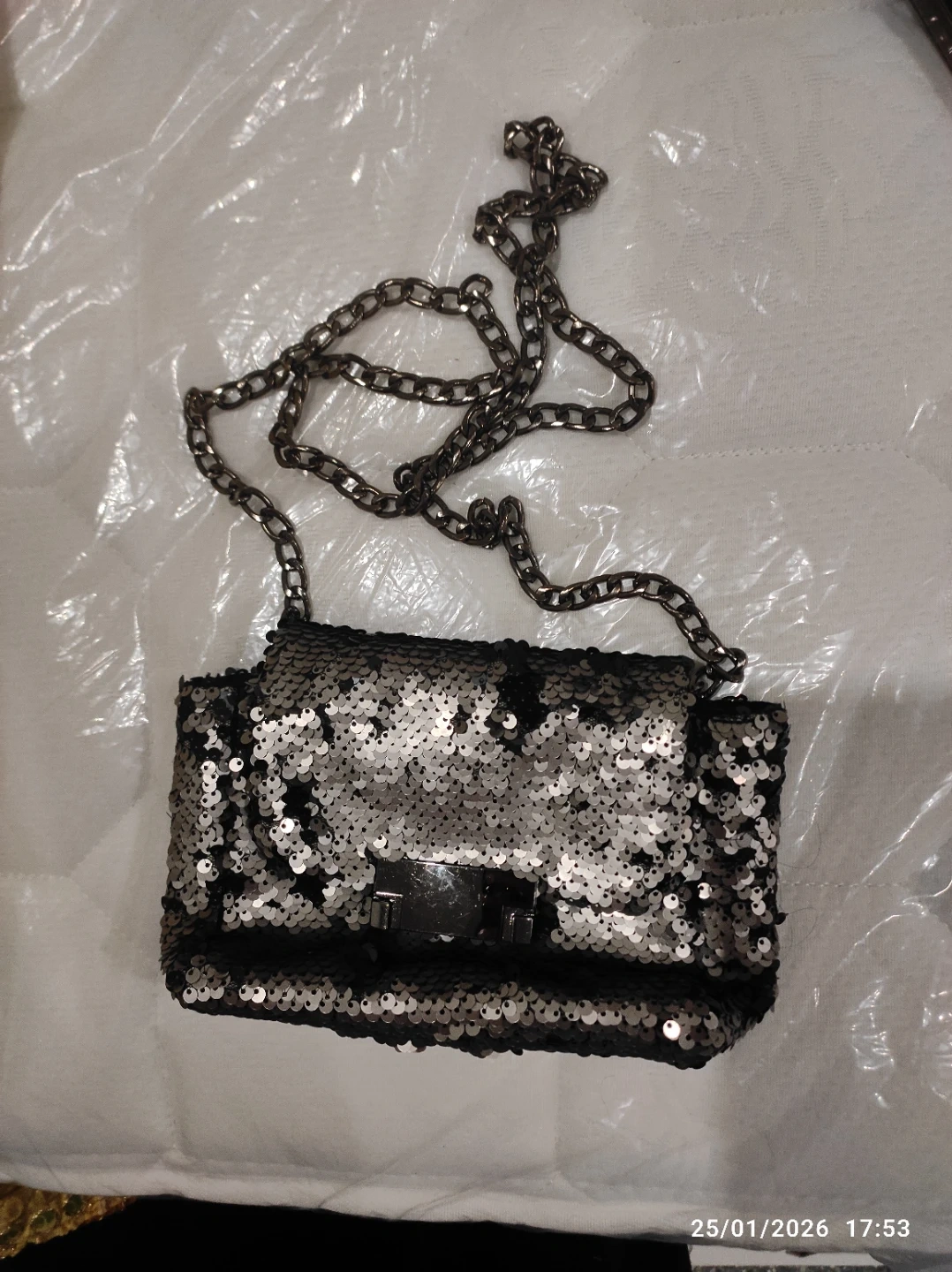 This stylish clutch purse is covered in sparkling silver and black sequins. It features a metal clasp closure and a detachable silver chain strap. Great for a night out!