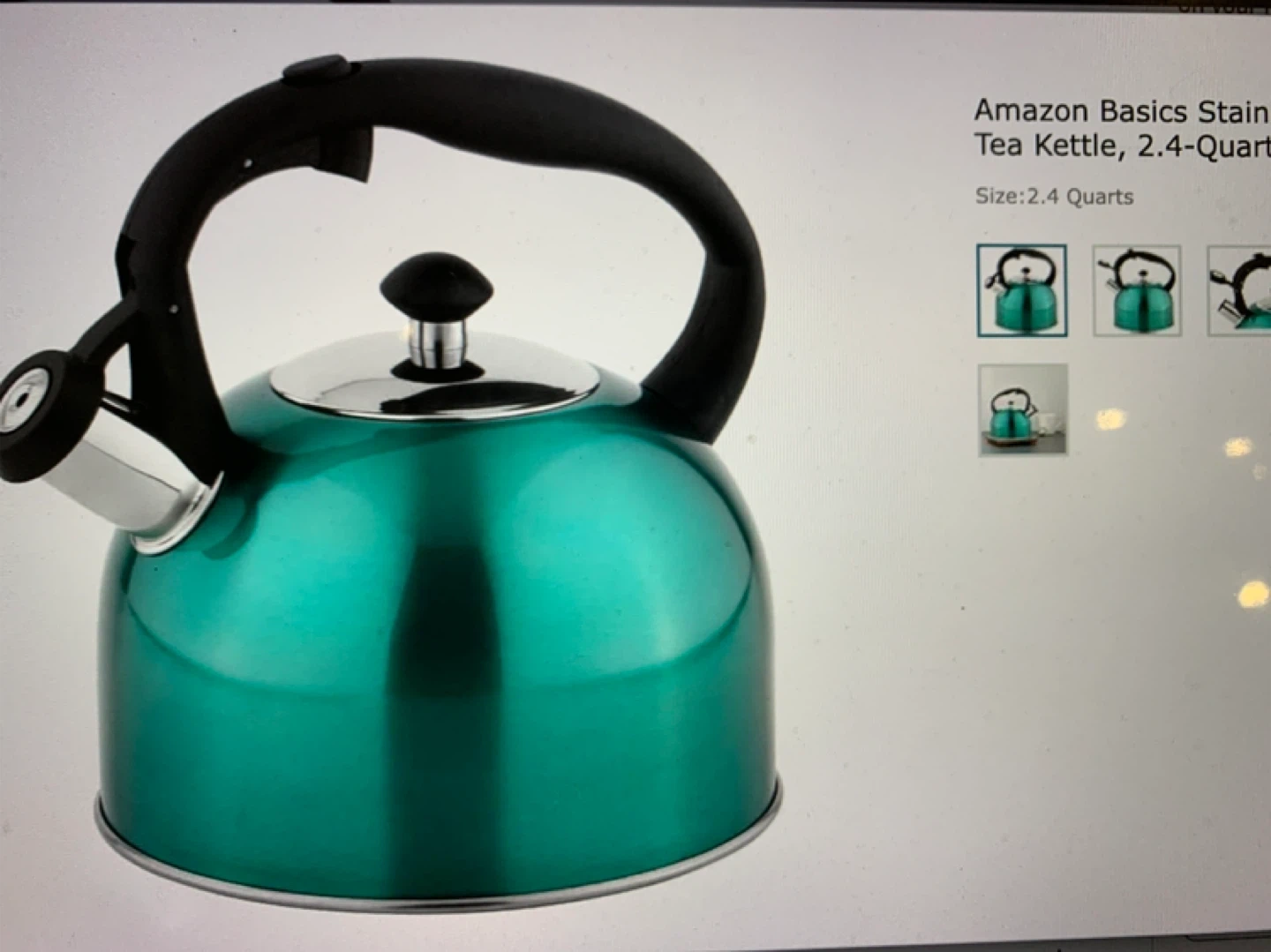 This Amazon Basics tea kettle holds 2.4 quarts. It's made of stainless steel with a black handle. Great for making tea or hot beverages!