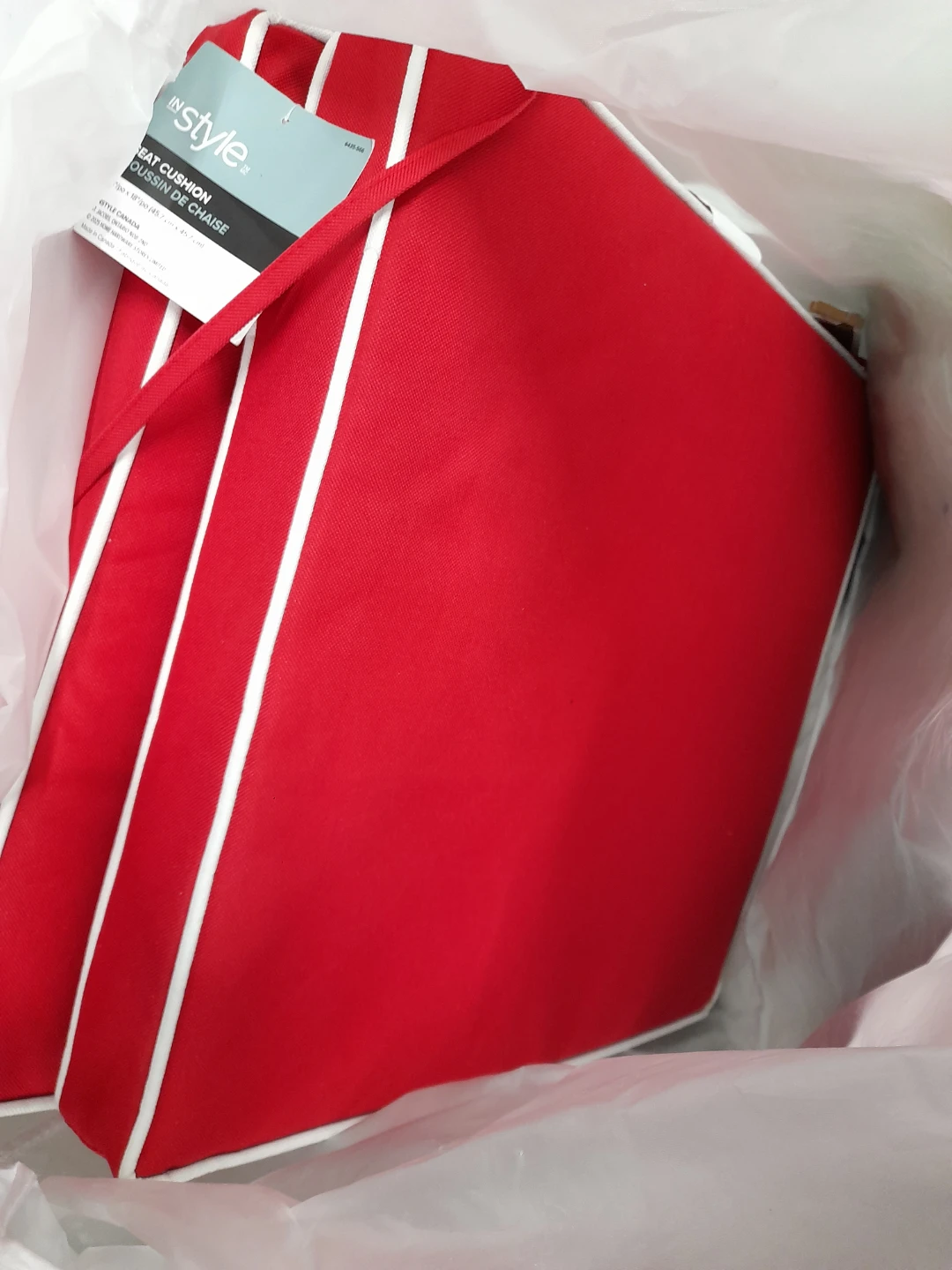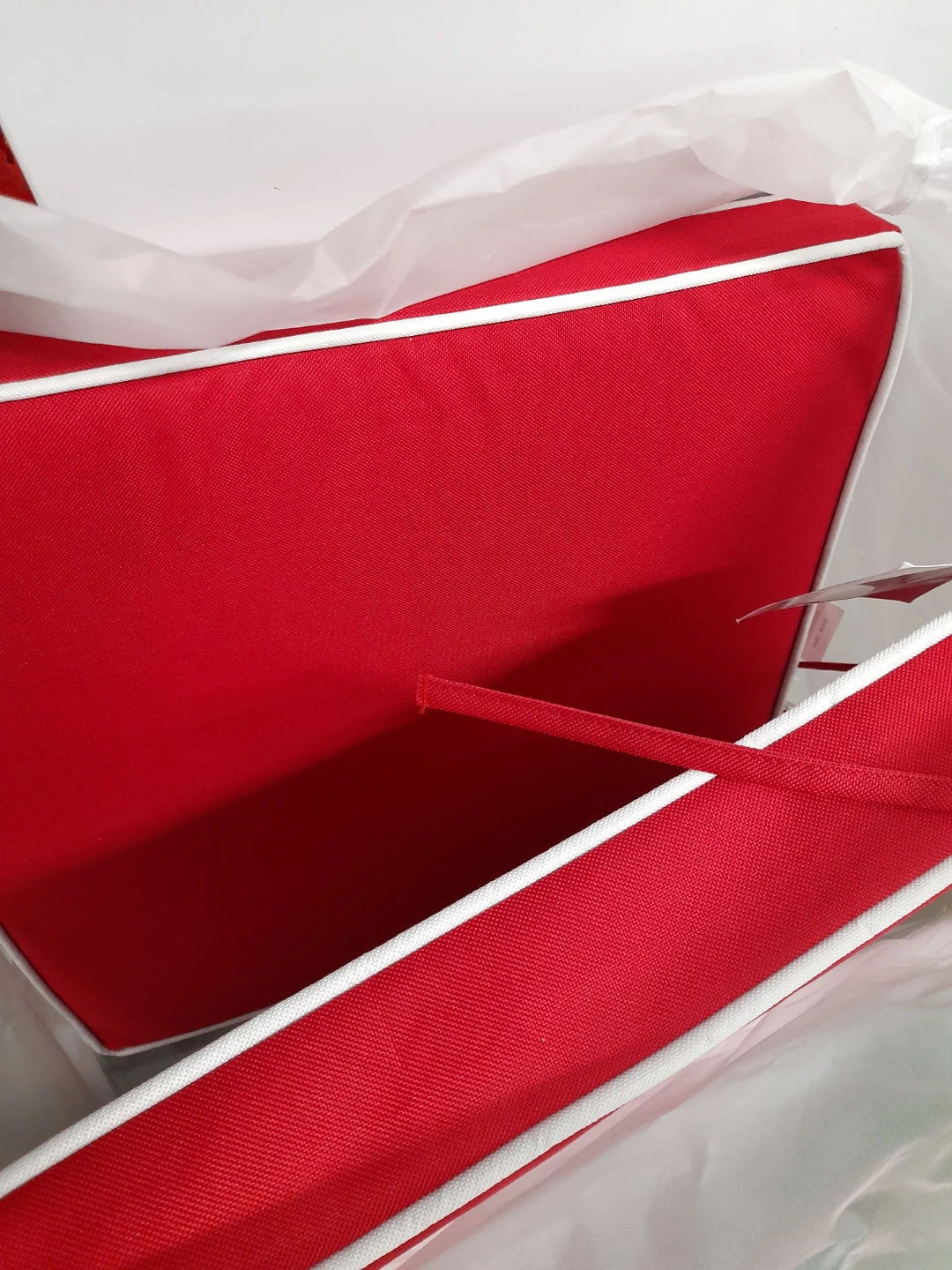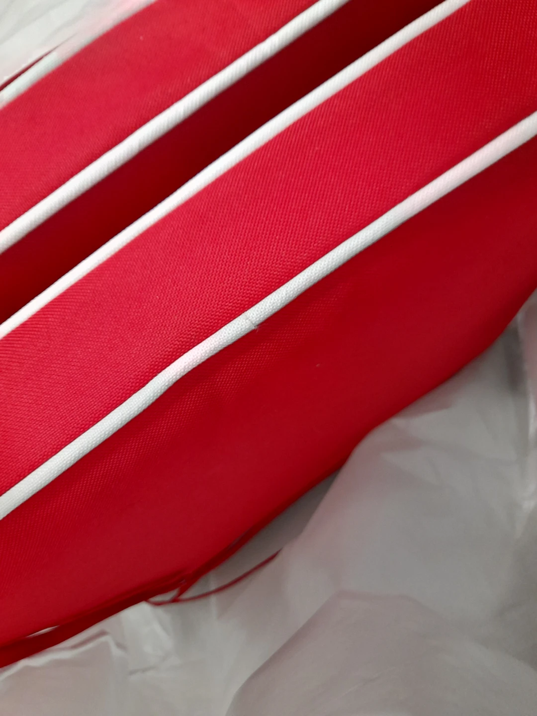 Two red seat cushions with white piping. Fabric appears durable and suitable for outdoor use. These cushions are designed to fit most standard chairs.
