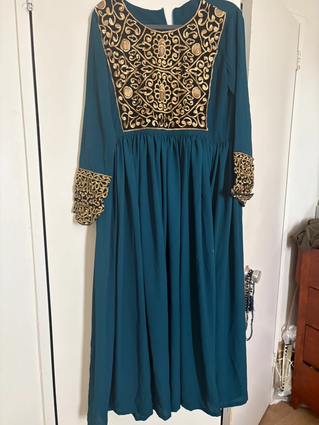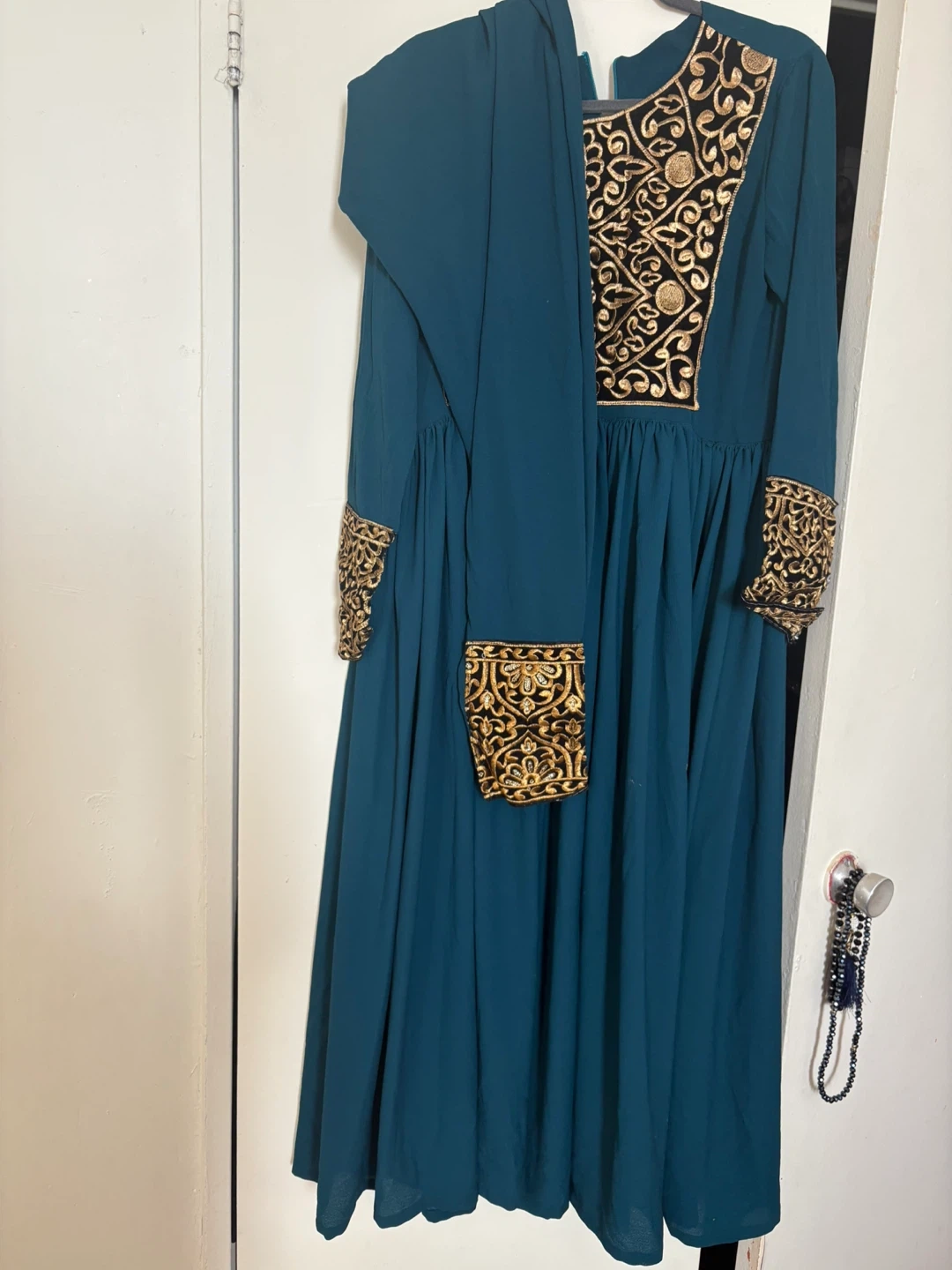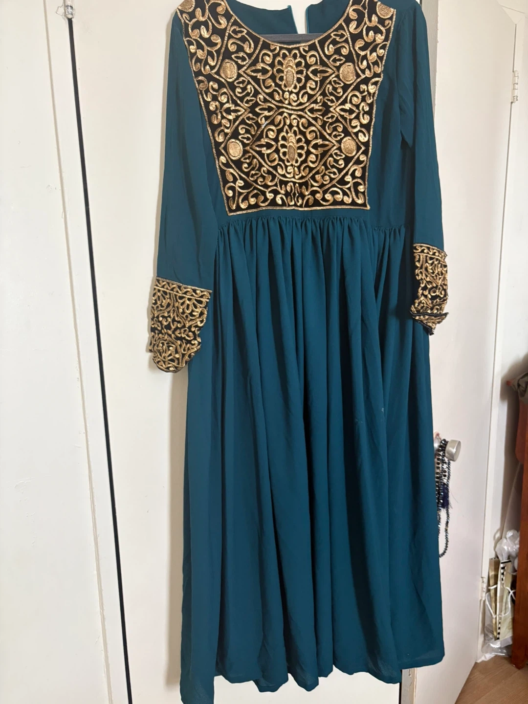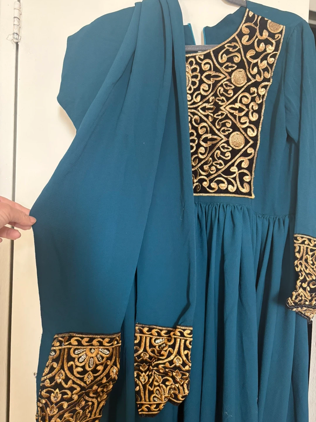 Beautiful teal maxi dress featuring intricate gold embroidery on the bodice and sleeves. It's made from a lightweight, flowing fabric. Comes with a matching scarf. Perfect for special occasions!