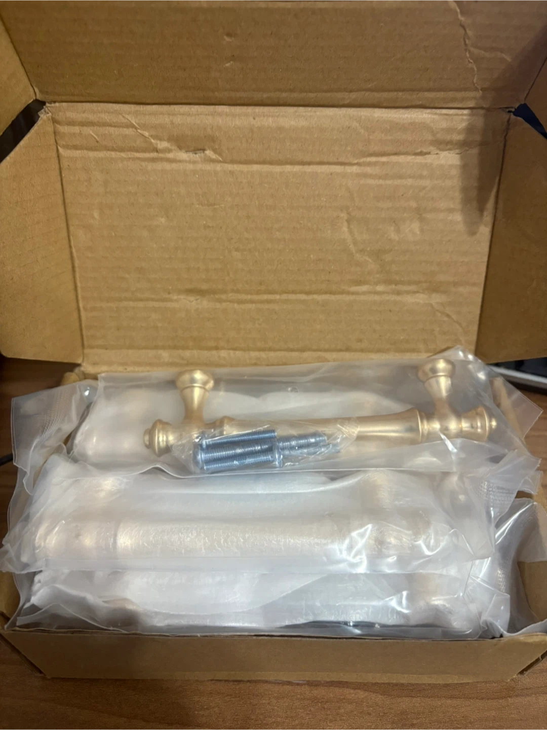 Selling a set of gold cabinet pulls, still new in the box! They are about 4 inches in length. Each pull comes with its own set of screws. Box is included!