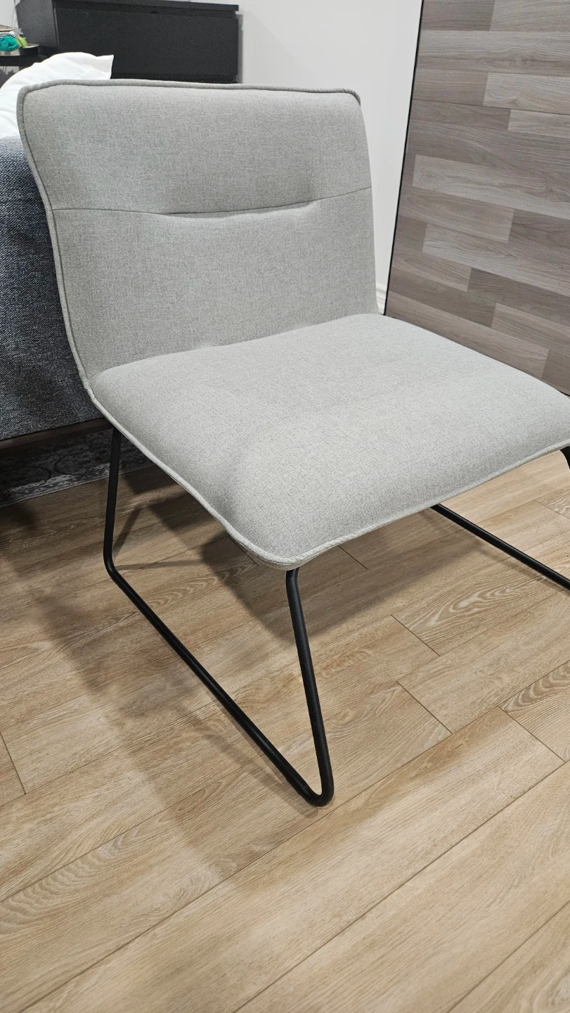 This accent chair features a comfortable upholstered seat and back in a light grey fabric. It's supported by sleek black metal legs for a modern look. This chair is a nice addition to any living room or bedroom space.
