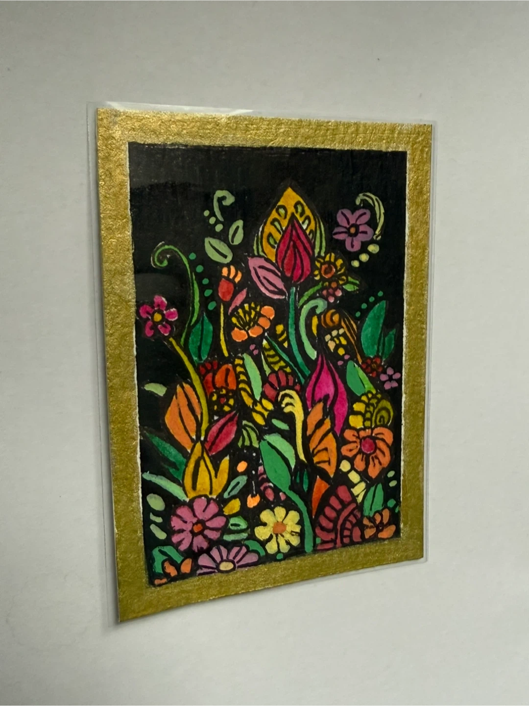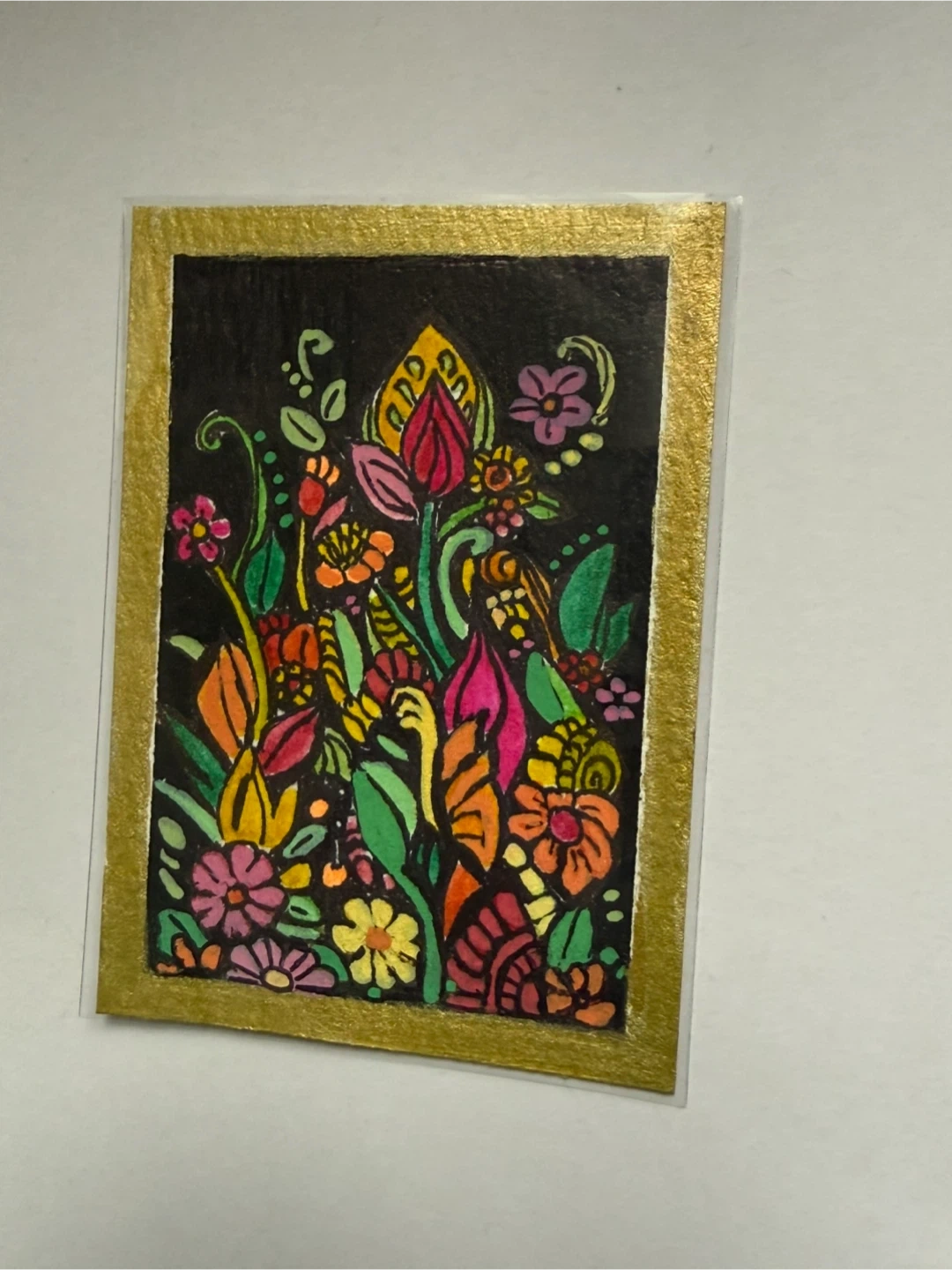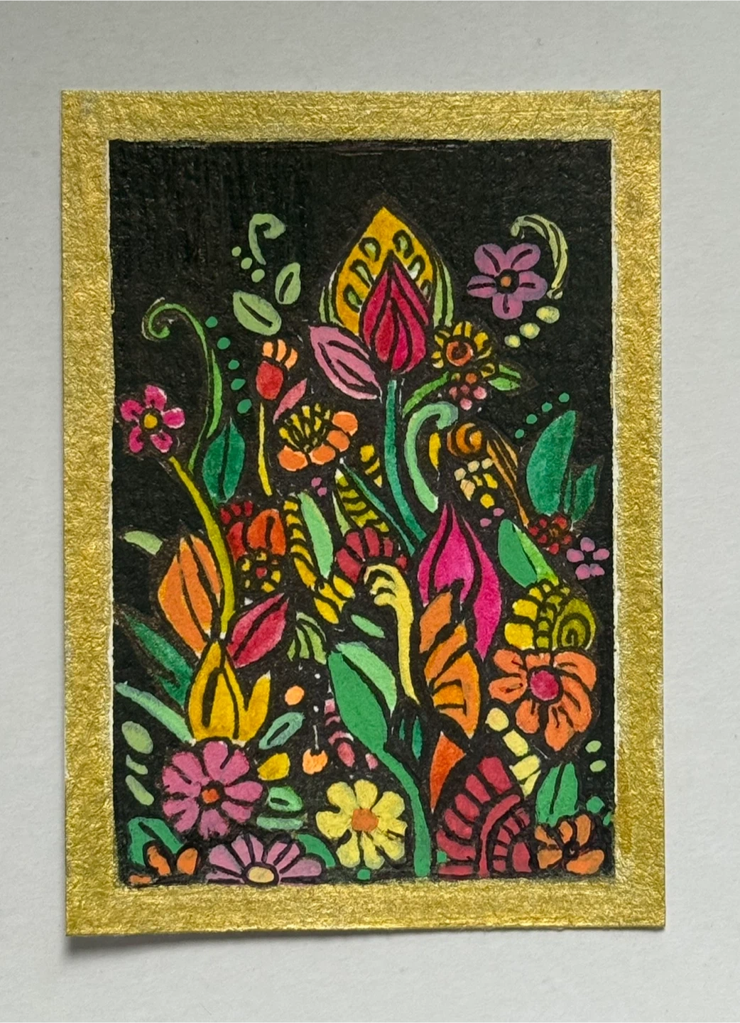A vibrant composition of a colourful array of flowers on a black background with a gold border. It comes in a protective penny sleeve. It can be displayed in a mini frame; make a perfect thoughtful one-of-a-kind little gift to your favourite plant lover.
