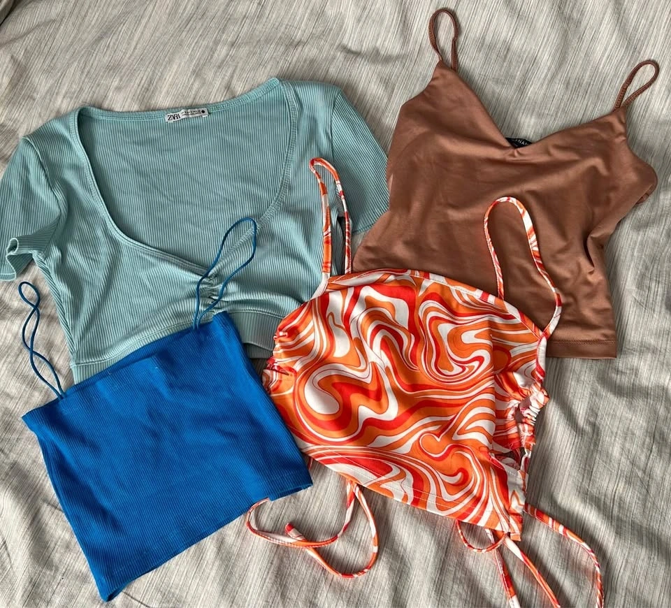 Four cute tops for sale: Turquoise top (Zara, small), Brown top (Dynamite, x-small), Orange top (Shein, small - also works as swimwear), and Dark blue top (Zara, small). All tops are used but in great condition with intact stitching and no flaws, stains, or rips. Selling for $5 each or $15 for the whole lot. Pickup in Scarborough from a smoke-free home.
