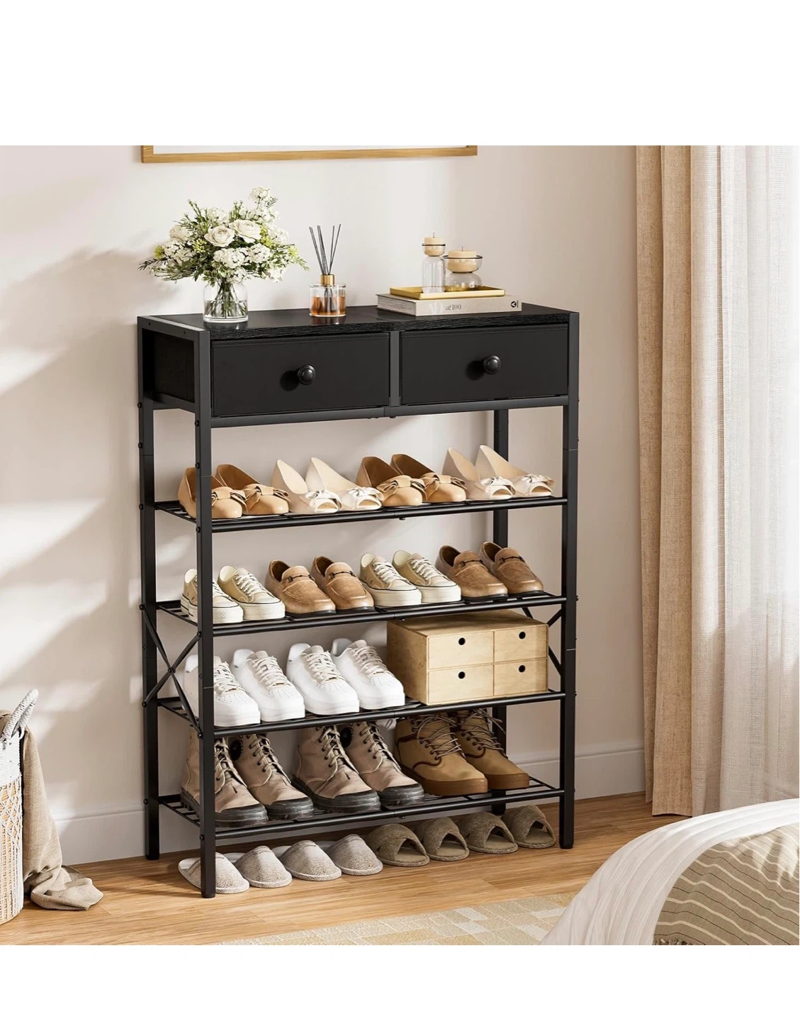 This black shoe rack has five wire shelves for footwear storage and two fabric drawers at the top. Dimensions: 70cm W x 27.5cm D x 96cm H. It's great for organizing entryways or closets!