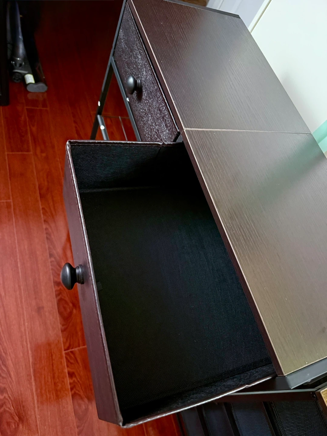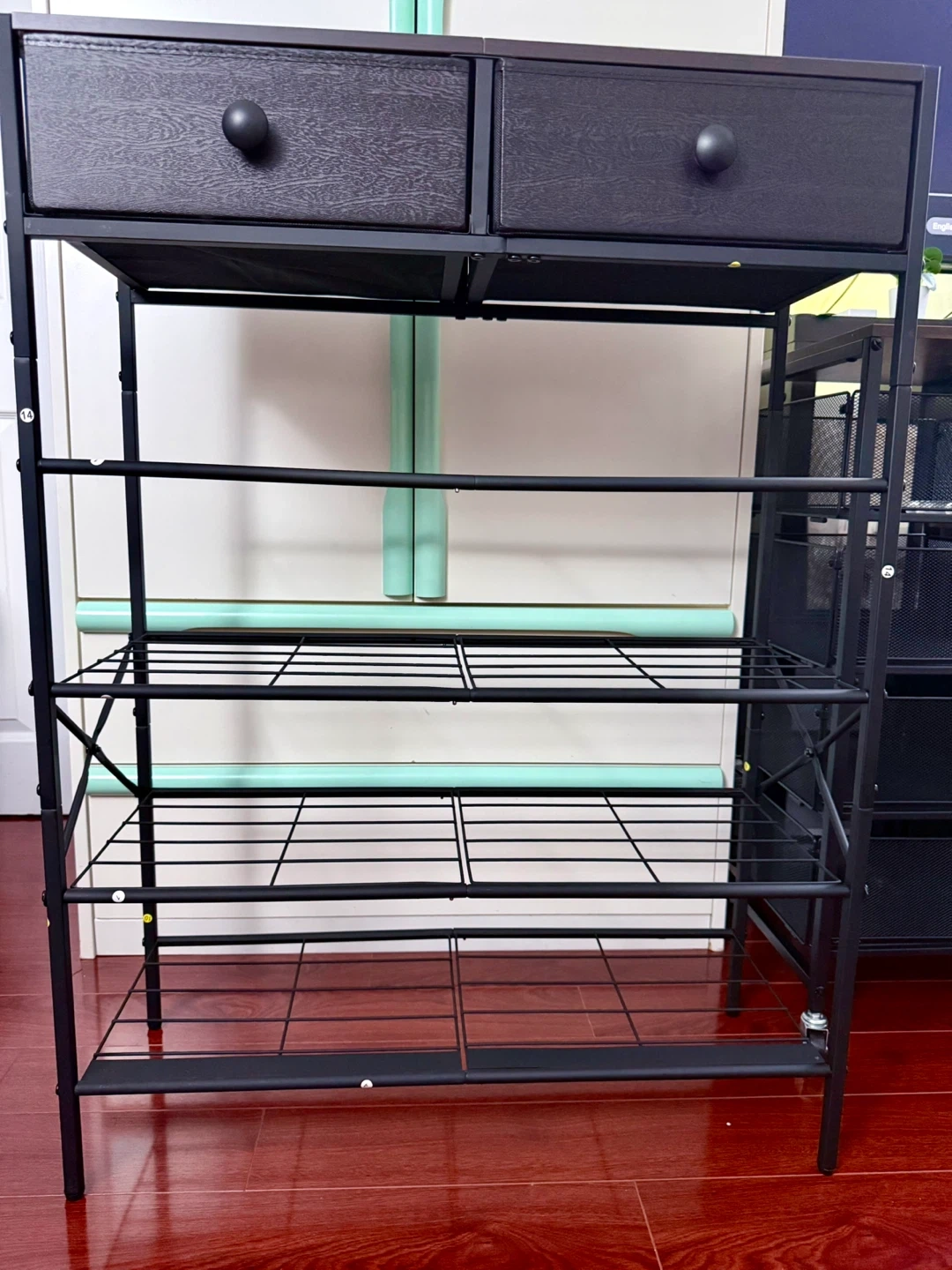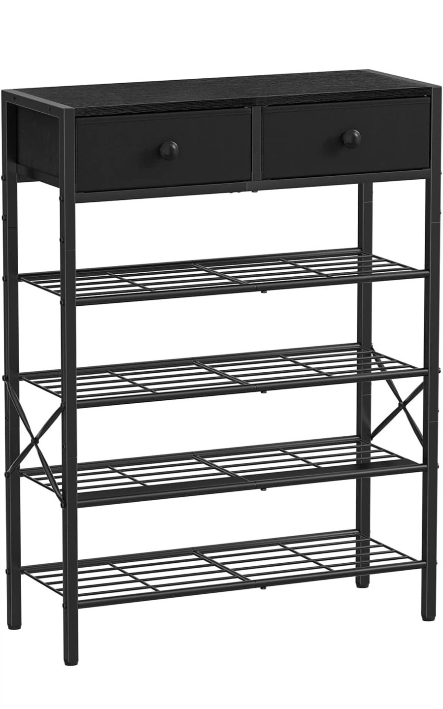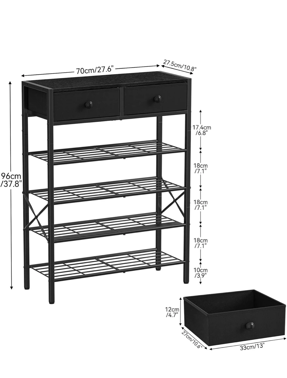 This black shoe rack has five wire shelves for footwear storage and two fabric drawers at the top. Dimensions: 70cm W x 27.5cm D x 96cm H. It's great for organizing entryways or closets!
