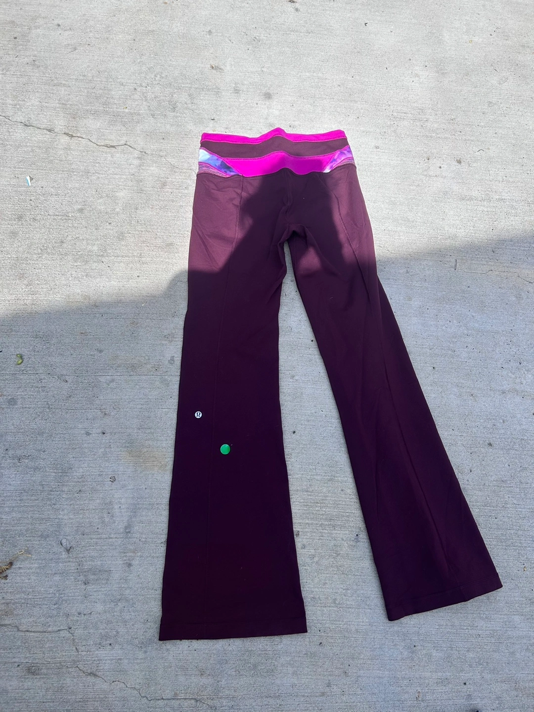 Selling a pair of Lululemon Leggings in burgundy, size 6. They're in great condition and super comfy for yoga or just lounging around. The waistband has a fun pattern too!