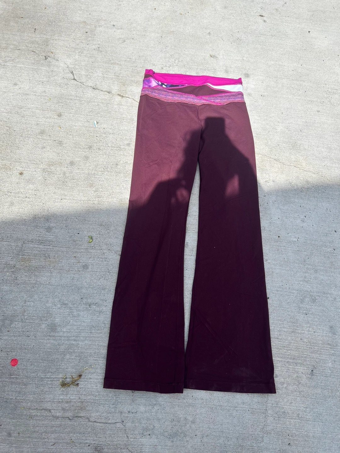 Selling a pair of Lululemon Leggings in burgundy, size 6. They're in great condition and super comfy for yoga or just lounging around. The waistband has a fun pattern too!