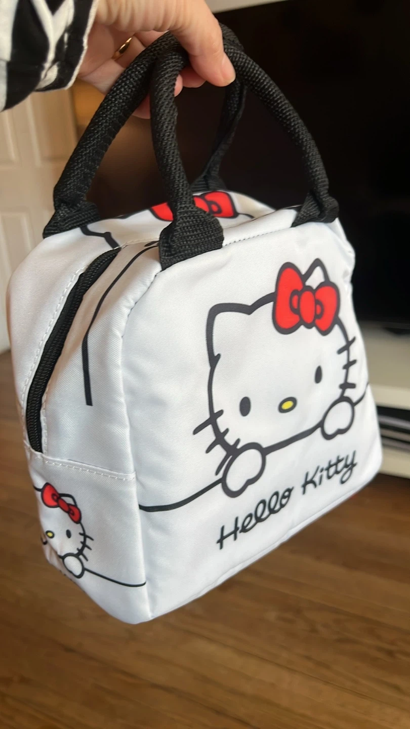 Cute white insulated lunch bag featuring Hello Kitty graphics. It's perfect for packing snacks or a small meal. Zipper closure and sturdy handles for easy carrying!