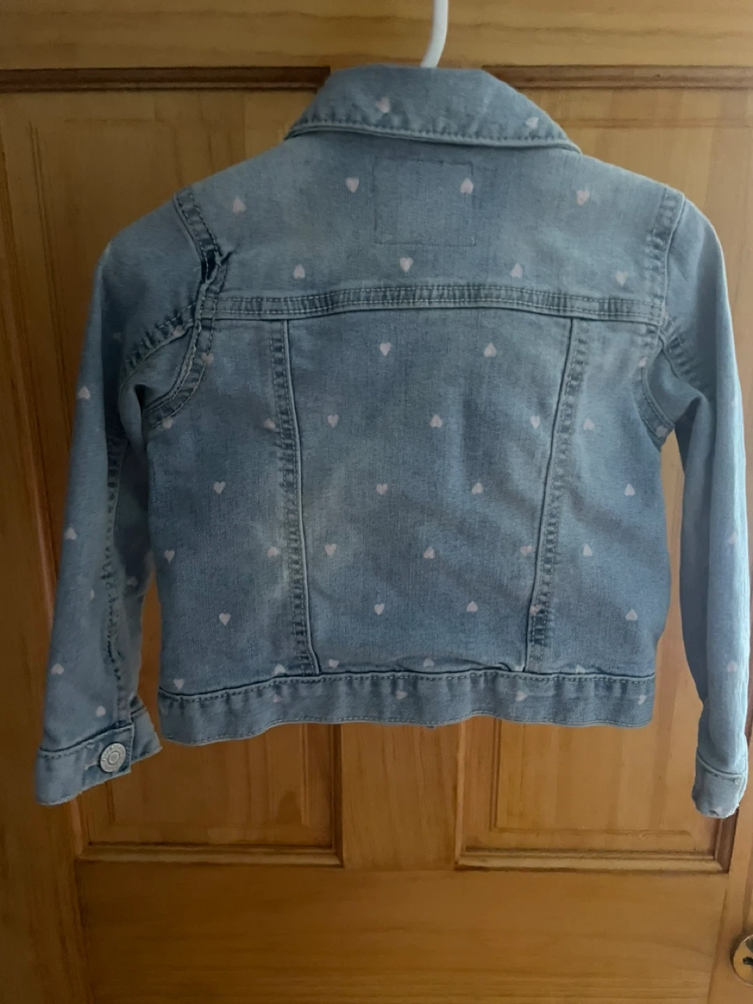 This OshKosh B'gosh denim jacket is designed for toddlers. It's light wash denim with a subtle pink heart pattern. Made of 100% cotton. Great for everyday wear!