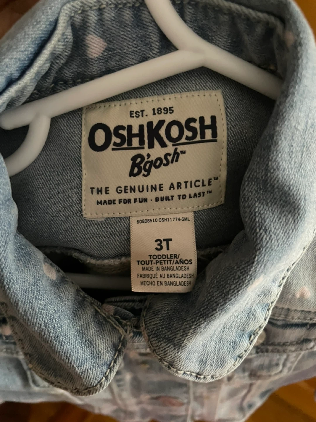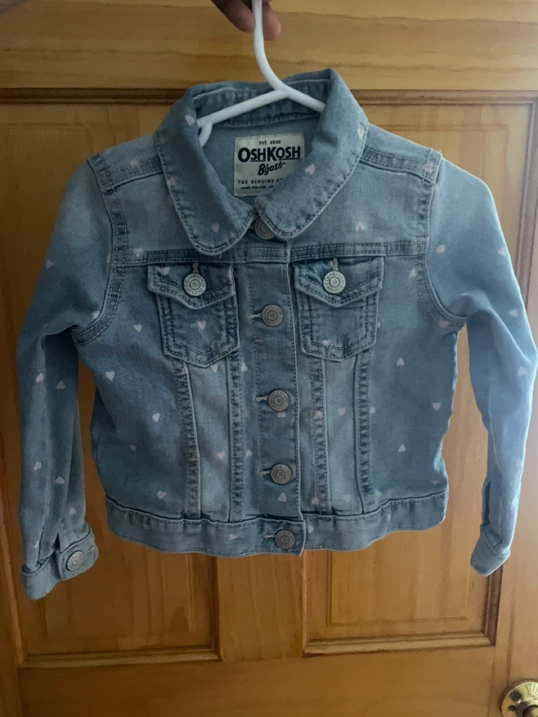 This OshKosh B'gosh denim jacket is designed for toddlers. It's light wash denim with a subtle pink heart pattern. Made of 100% cotton. Great for everyday wear!