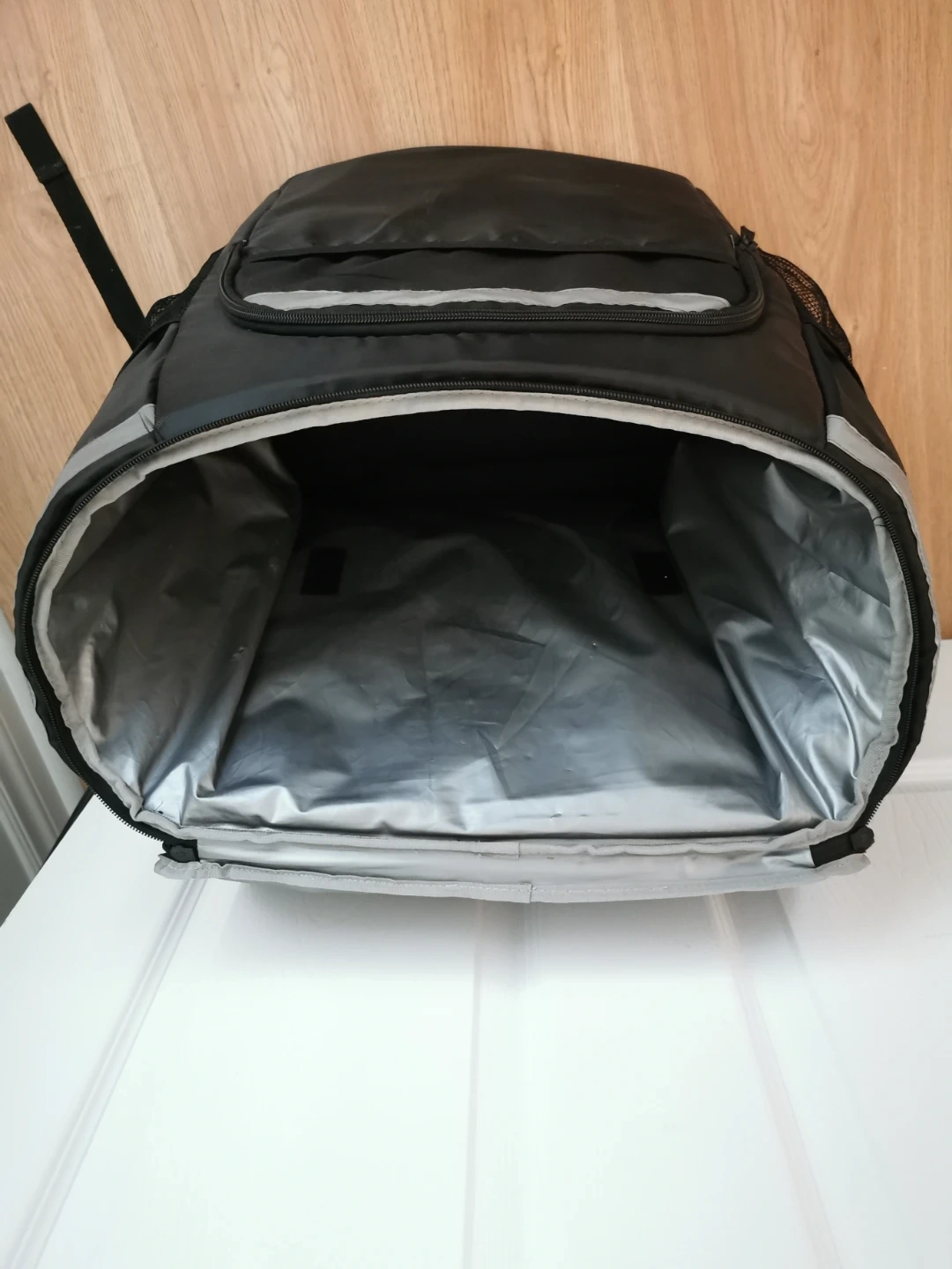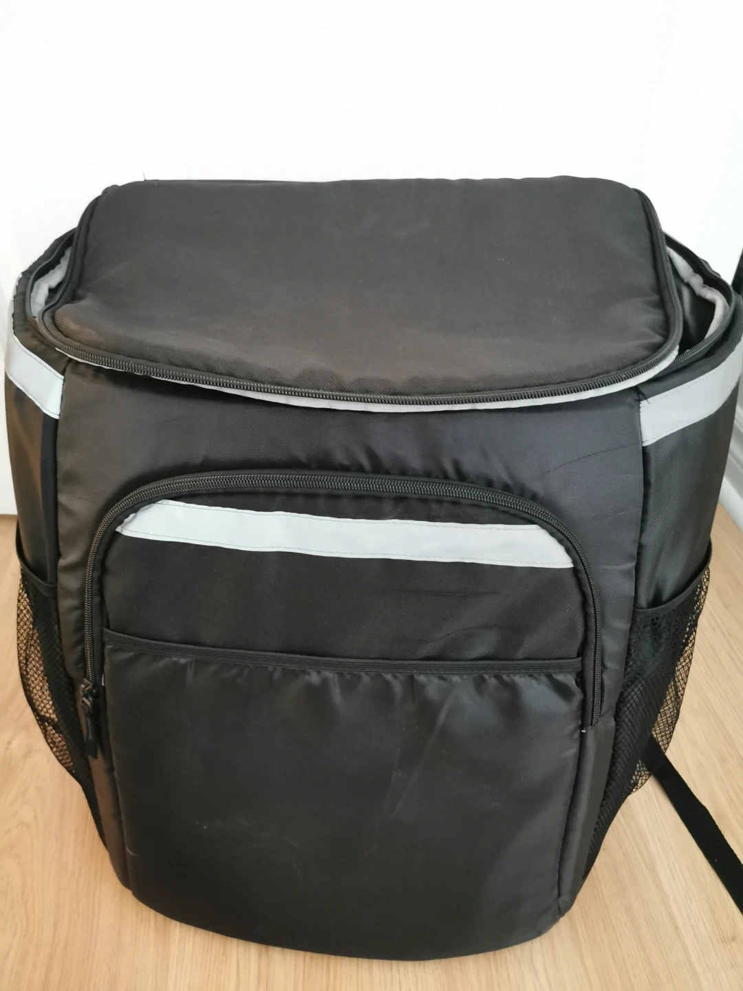 This black insulated delivery backpack is designed for durability and ease of transport. It features a spacious main compartment and side mesh pockets. The reflective strips enhance visibility in low light conditions.