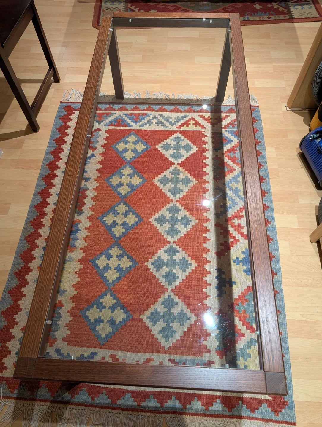 Selling an IKEA coffee table with a glass top and a sturdy wooden frame. It's in good condition