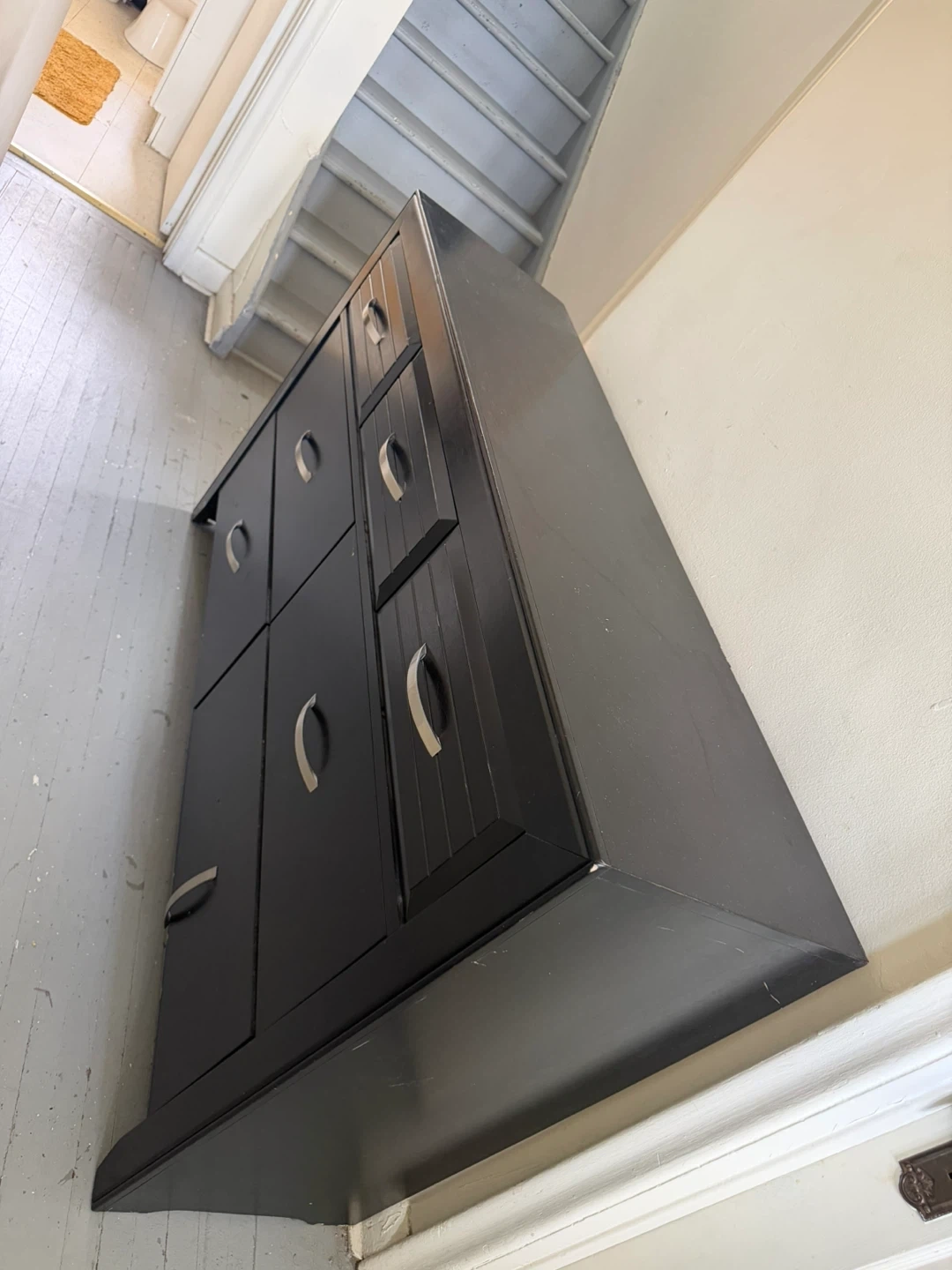 This black chest of drawers has a mix of large and small drawers for storage. It's finished with silver-toned handles. Looks great in any room!