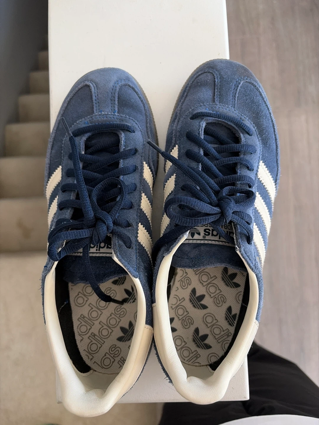 These are Adidas Spezial sneakers in a dark blue suede. They feature the classic three-stripe design and a comfortable fit. Good for everyday casual wear.