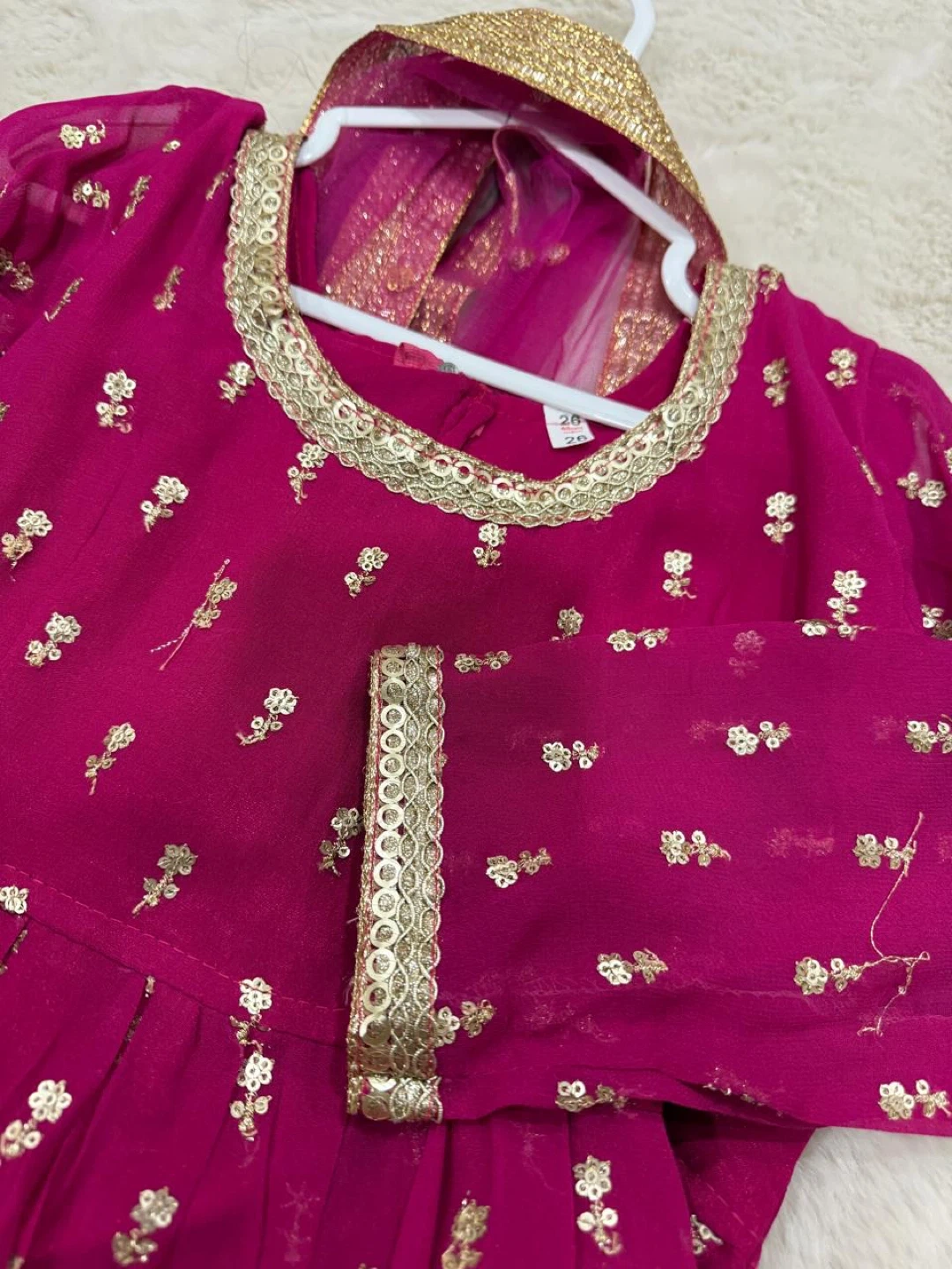 A beautiful magenta-pink girls' dress with gold embroidery all over. It features long sleeves with gold trim and comes with a matching dupatta. The neckline and hem also have ornate gold border work. This outfit is perfect for festive occasions and celebrations.