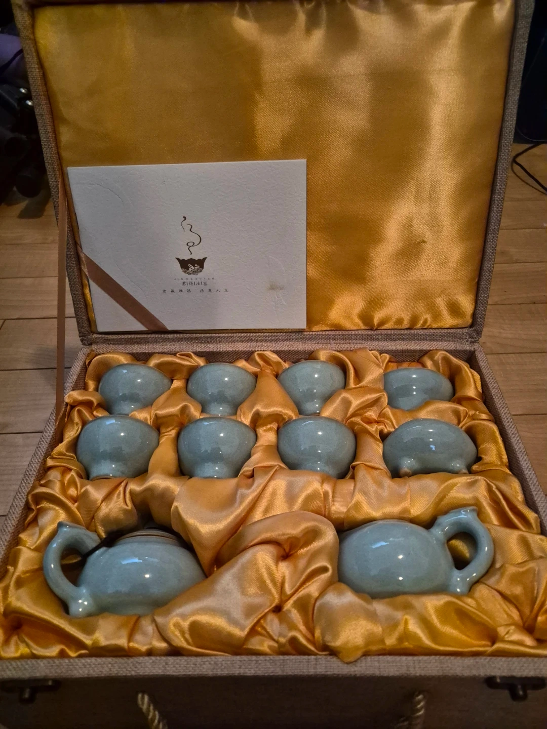 This tea set includes two teapots and eight small cups, all made of light blue ceramic. It comes presented in a fabric-covered case with a golden satin lining. The set is perfect for serving tea to a small group.