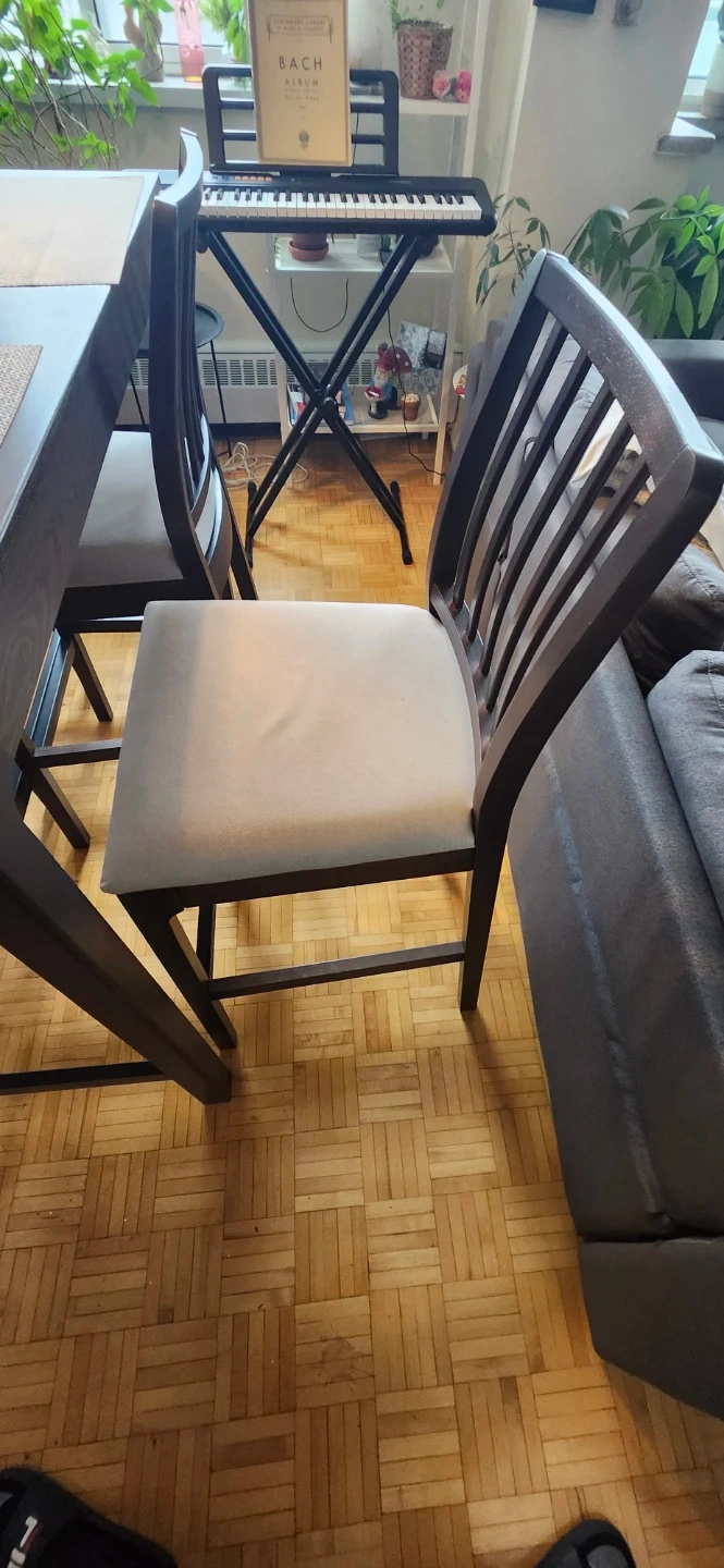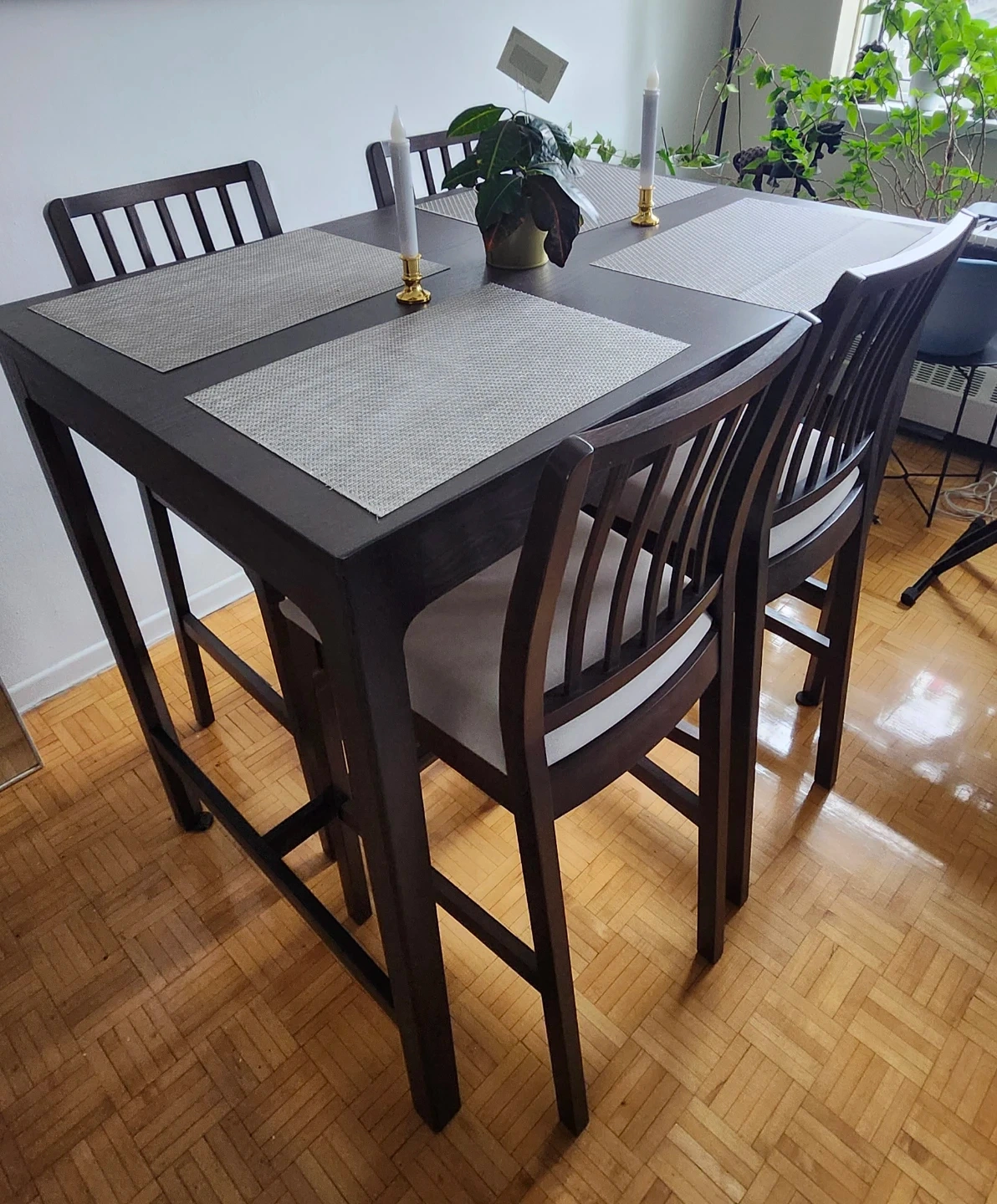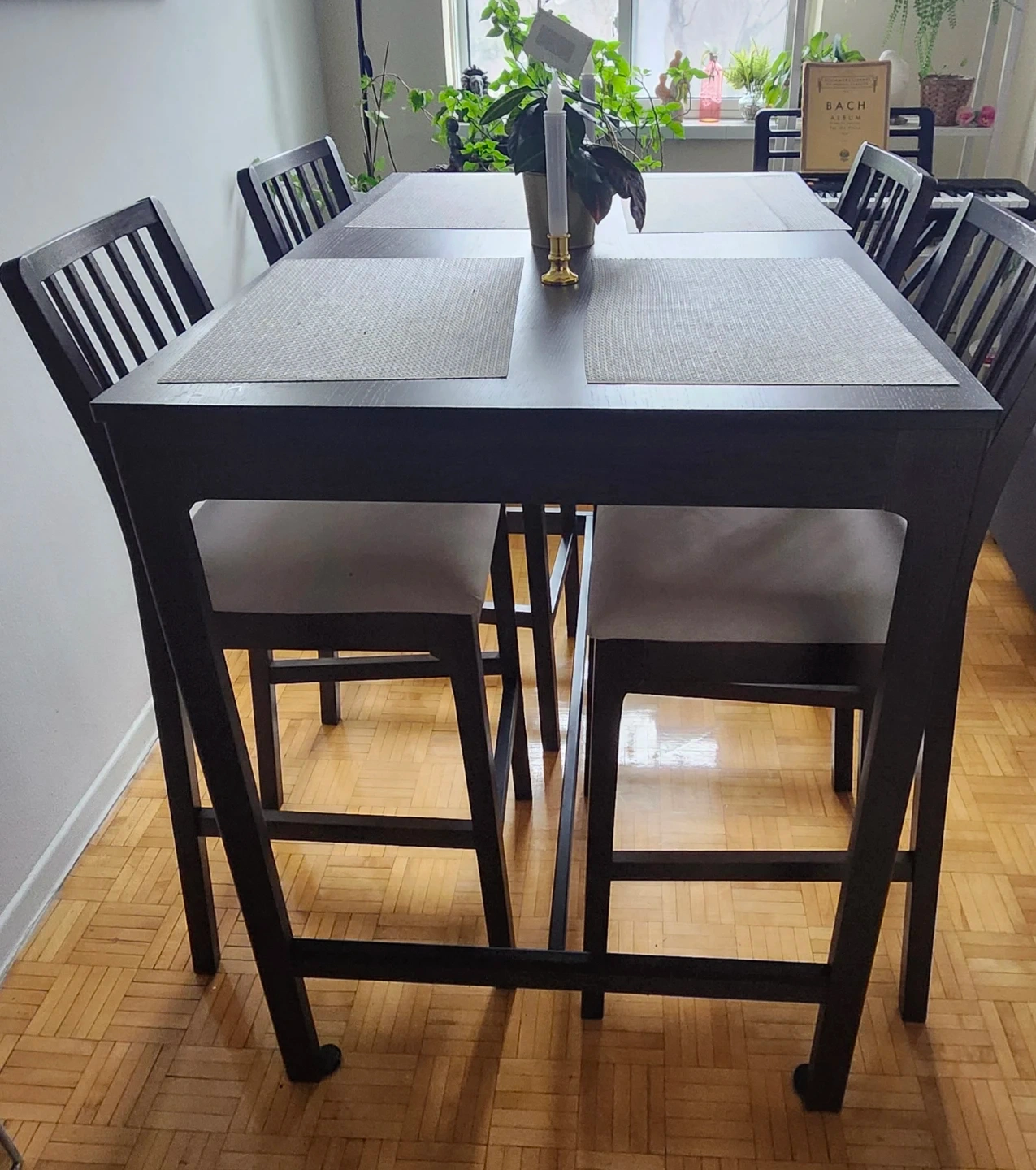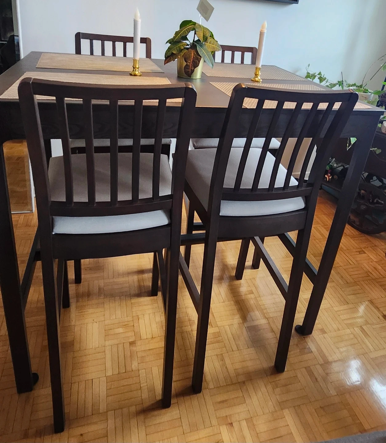 This is a dark wood counter height dining set. It includes a table and four matching chairs with light grey upholstered seats. The chairs have a slatted back design. Perfect condition listen to offers the price. His price now new its 900$ im selling in 400$ this price is for moving