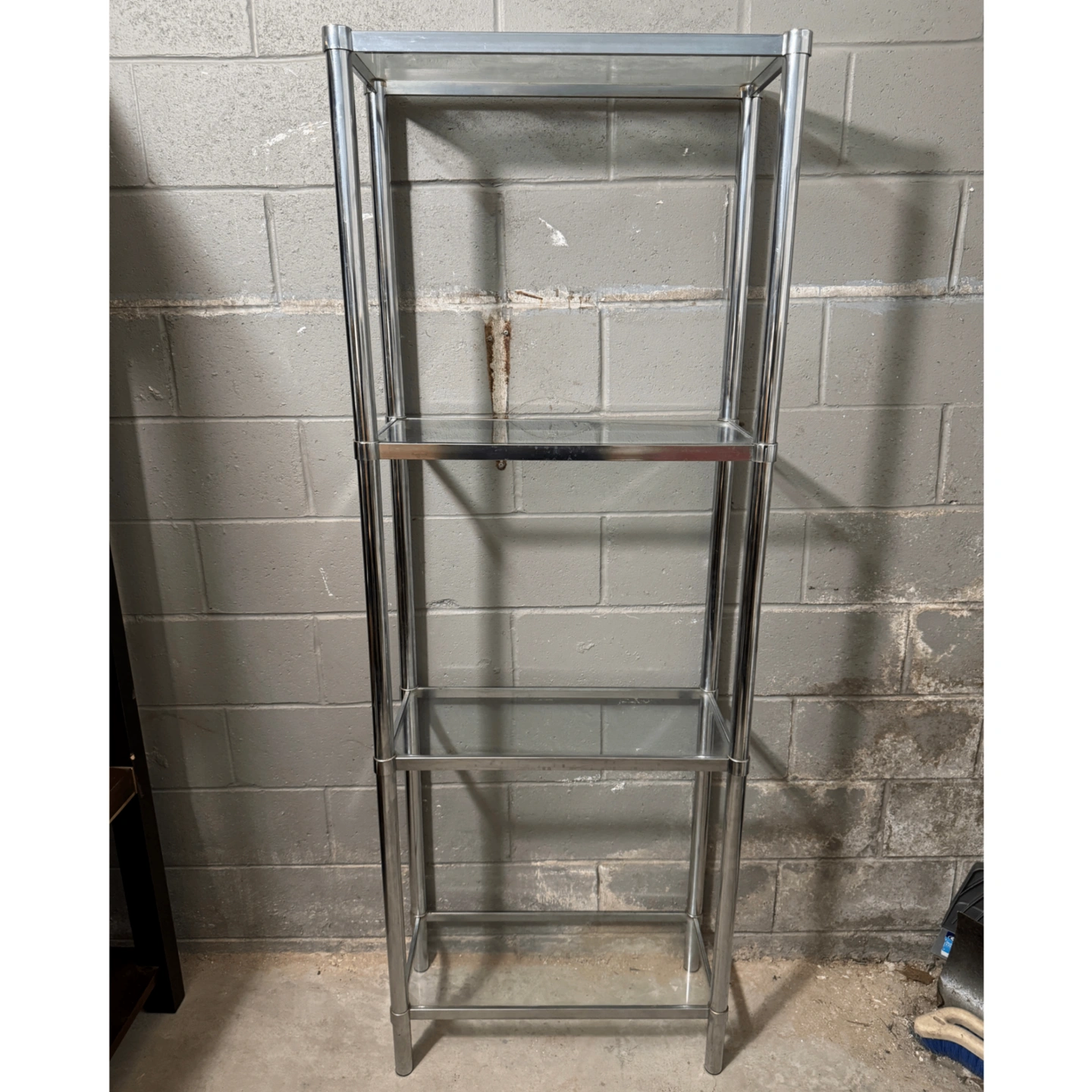 Selling a chrome and glass shelving unit. It measures approximately 12 inches wide, 26 inches deep, and 72 inches tall. It's in good condition and would be perfect for displaying items or adding storage space to any room