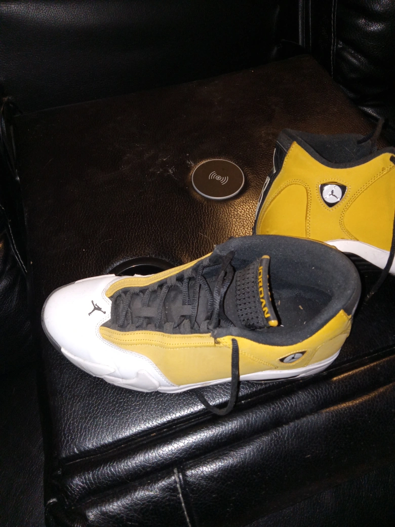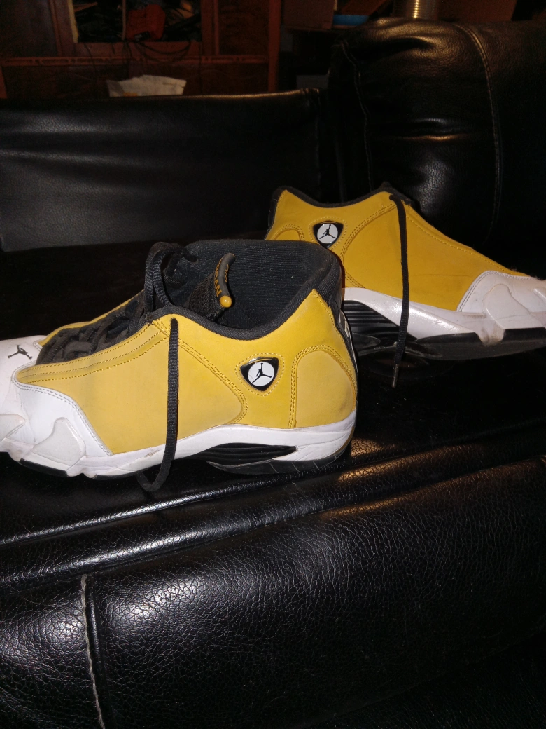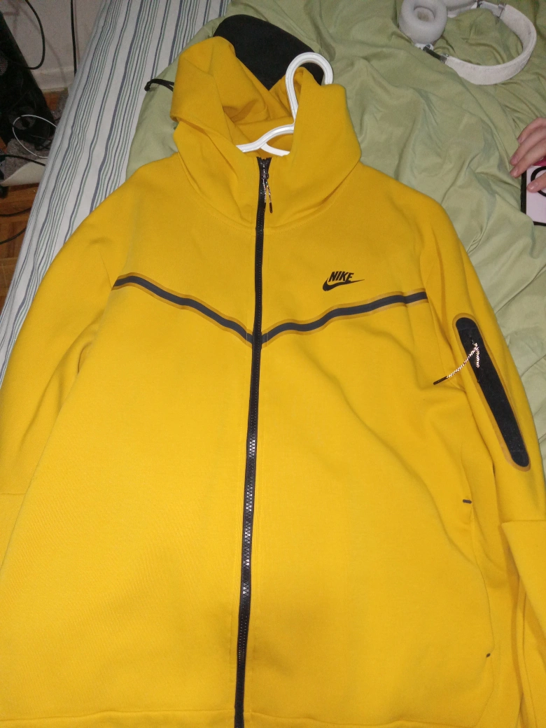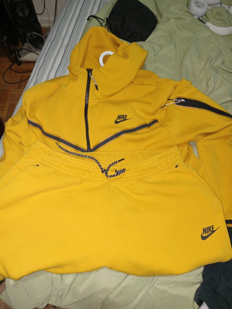 Selling a Nike Tech Fleece tracksuit and a pair of Air Jordan 14 shoes. Tracksuit includes a zip-up hoodie and sweatpants. Both are mustard yellow with black accents. Shoes are also yellow, black, and white. Great for casual wear.