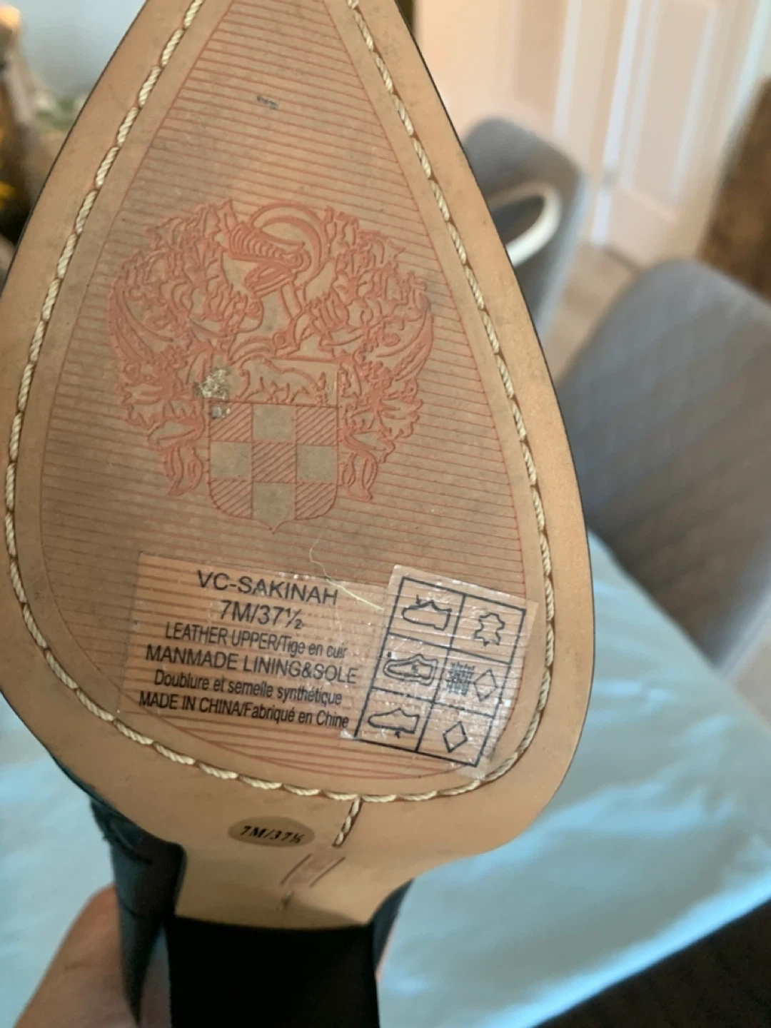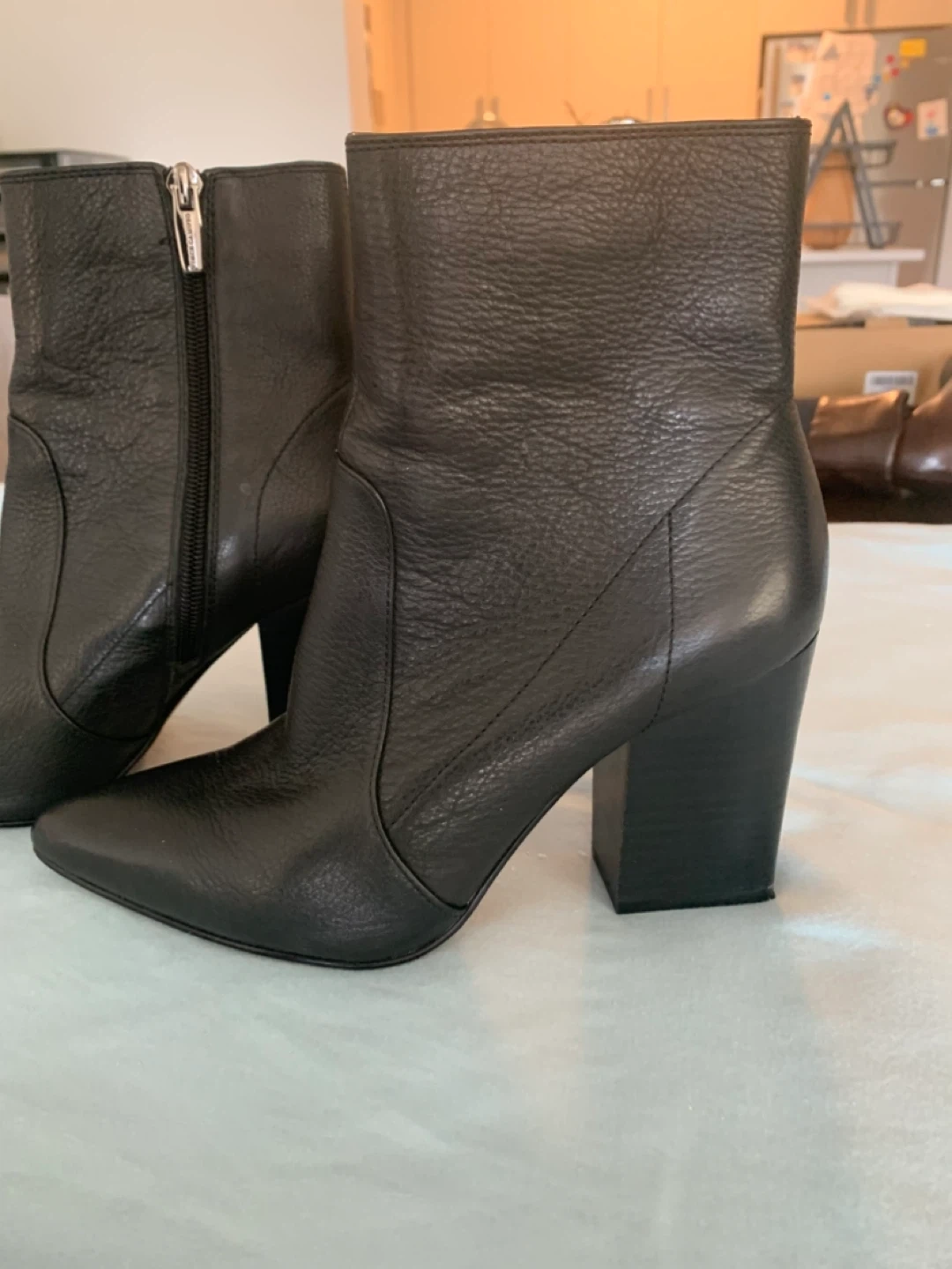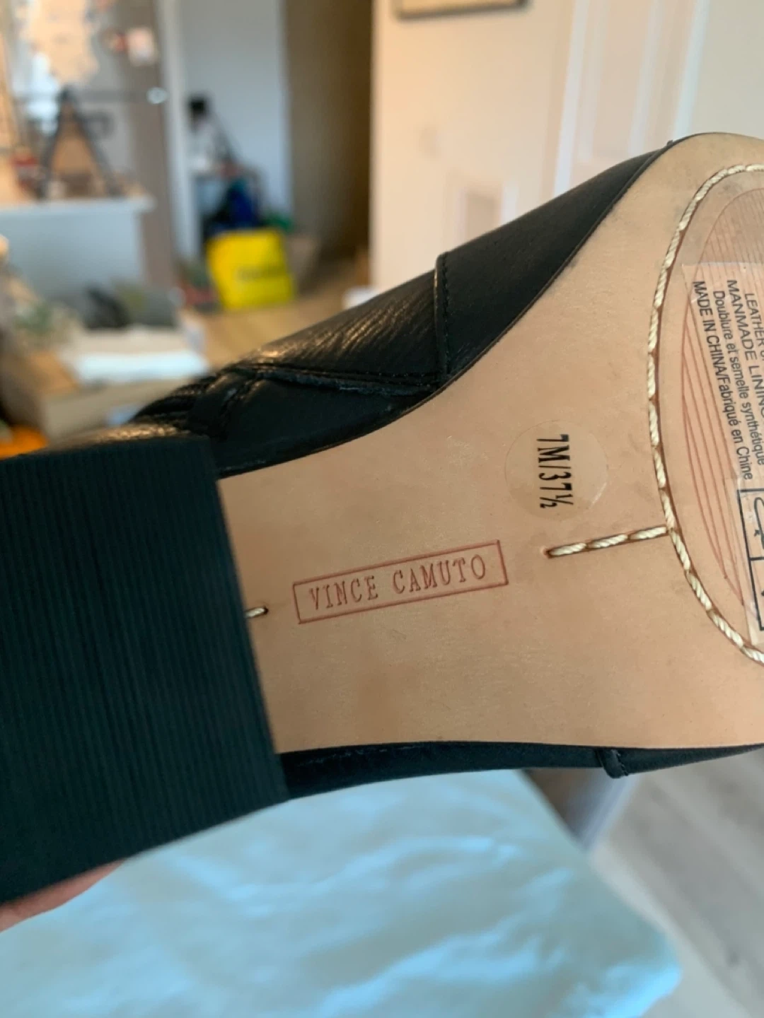 Selling a pair of Vince Camuto Sakinah booties in black leather. They're a size 7M/37½. The upper is leather, and the lining and sole are man-made