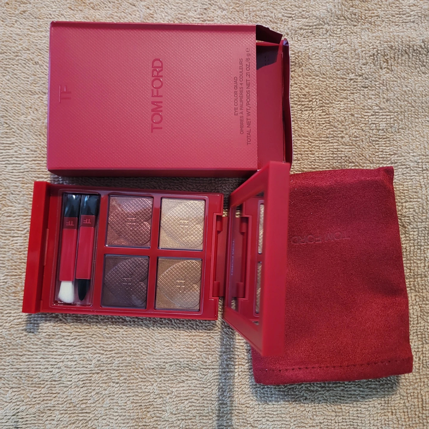 This is a Tom Ford Eye Colour Quad eyeshadow palette. It includes four shimmery eyeshadow shades. The palette comes with an applicator and a velvet pouch.