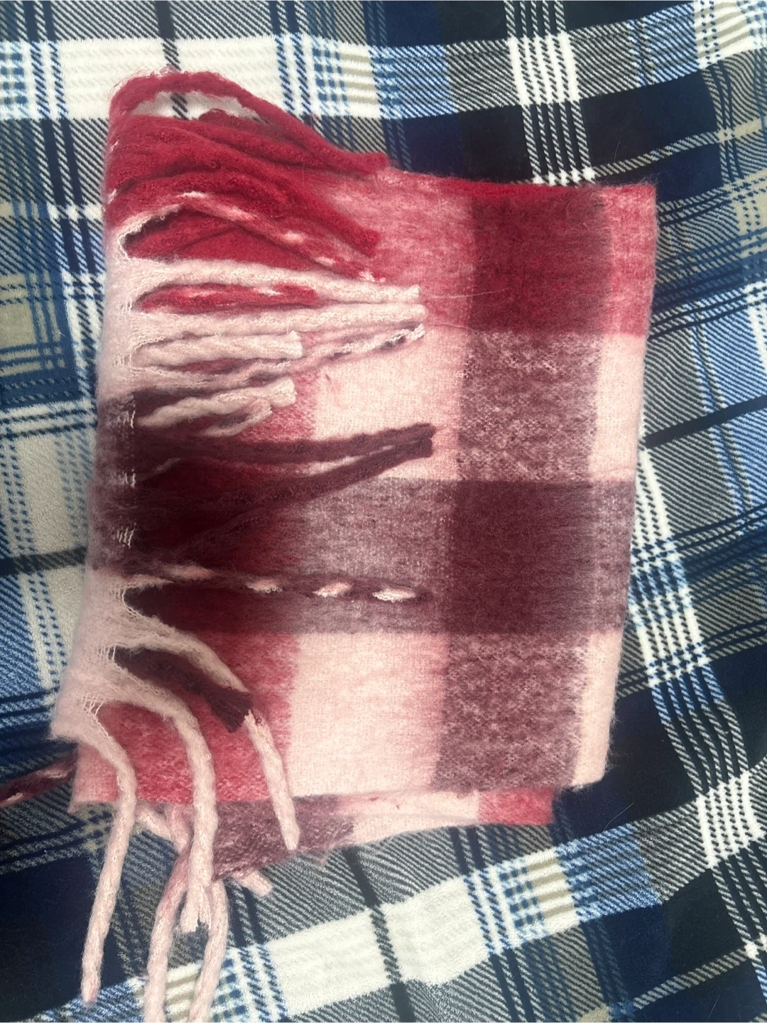 Cozy plaid scarf featuring pink, burgundy, and white checks. It has fringed edges for a touch of style. This scarf is made of a soft, fuzzy material perfect for cooler weather. Pick up cash only