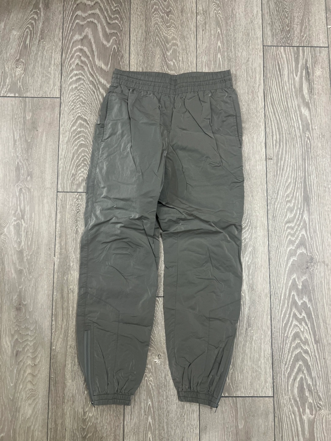 Grey track pants. Size XS. Elastic waistband with drawstring. Zip detail at ankles. Lightweight material. Excellent condition.