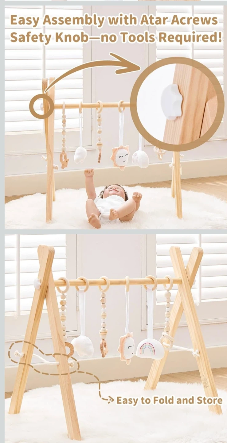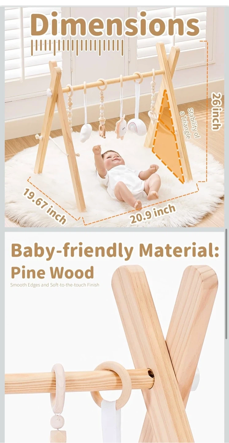 This wooden baby play gym is made from safe, odorless pine wood with smooth edges. It comes with 6 removable Montessori toys designed to engage your baby. The gym is easy to assemble with no tools required and folds for storage.