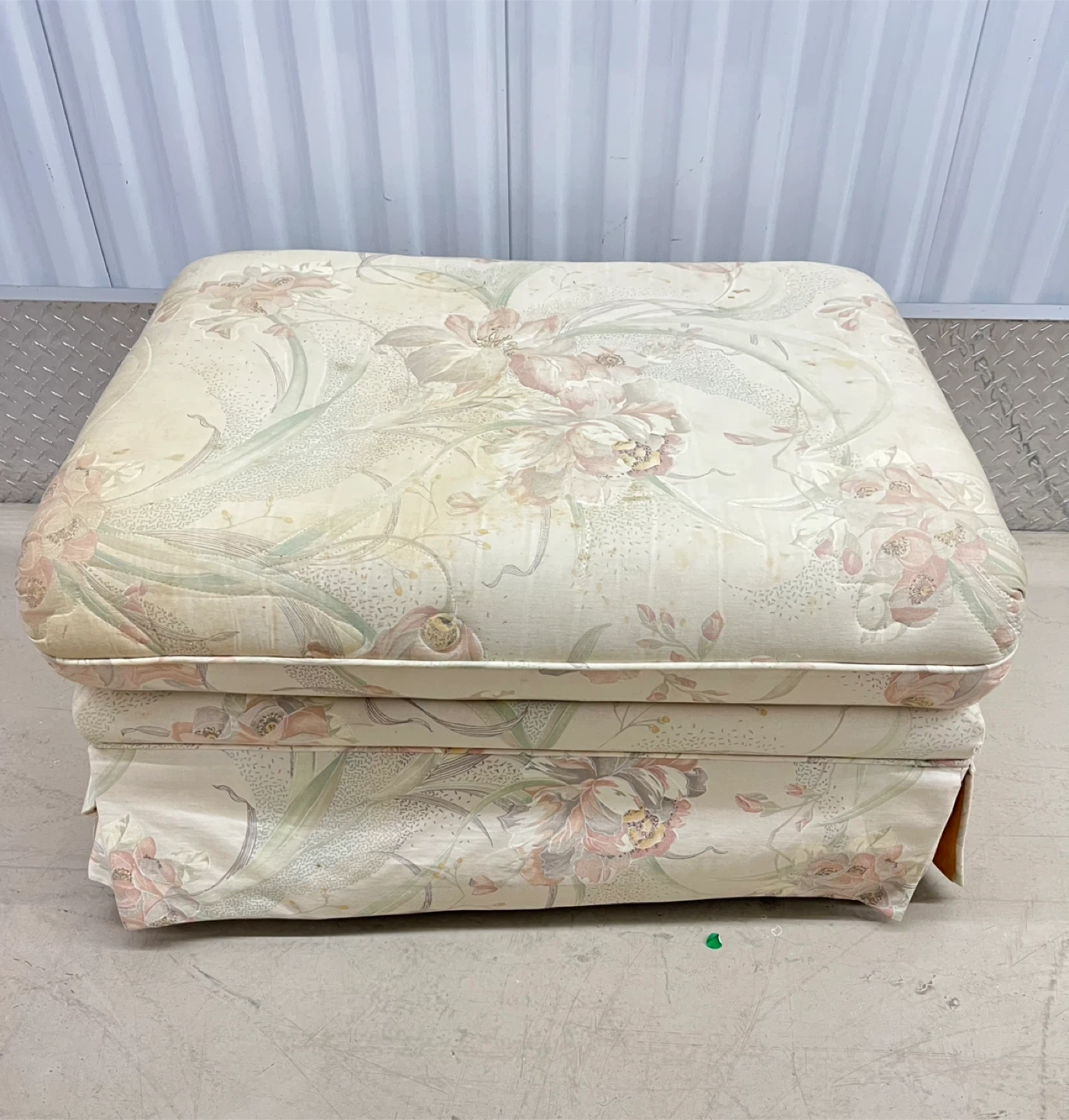 This upholstered ottoman features a pretty floral pattern. It's perfect for resting your feet after a long day. The skirted base adds a classic touch.
