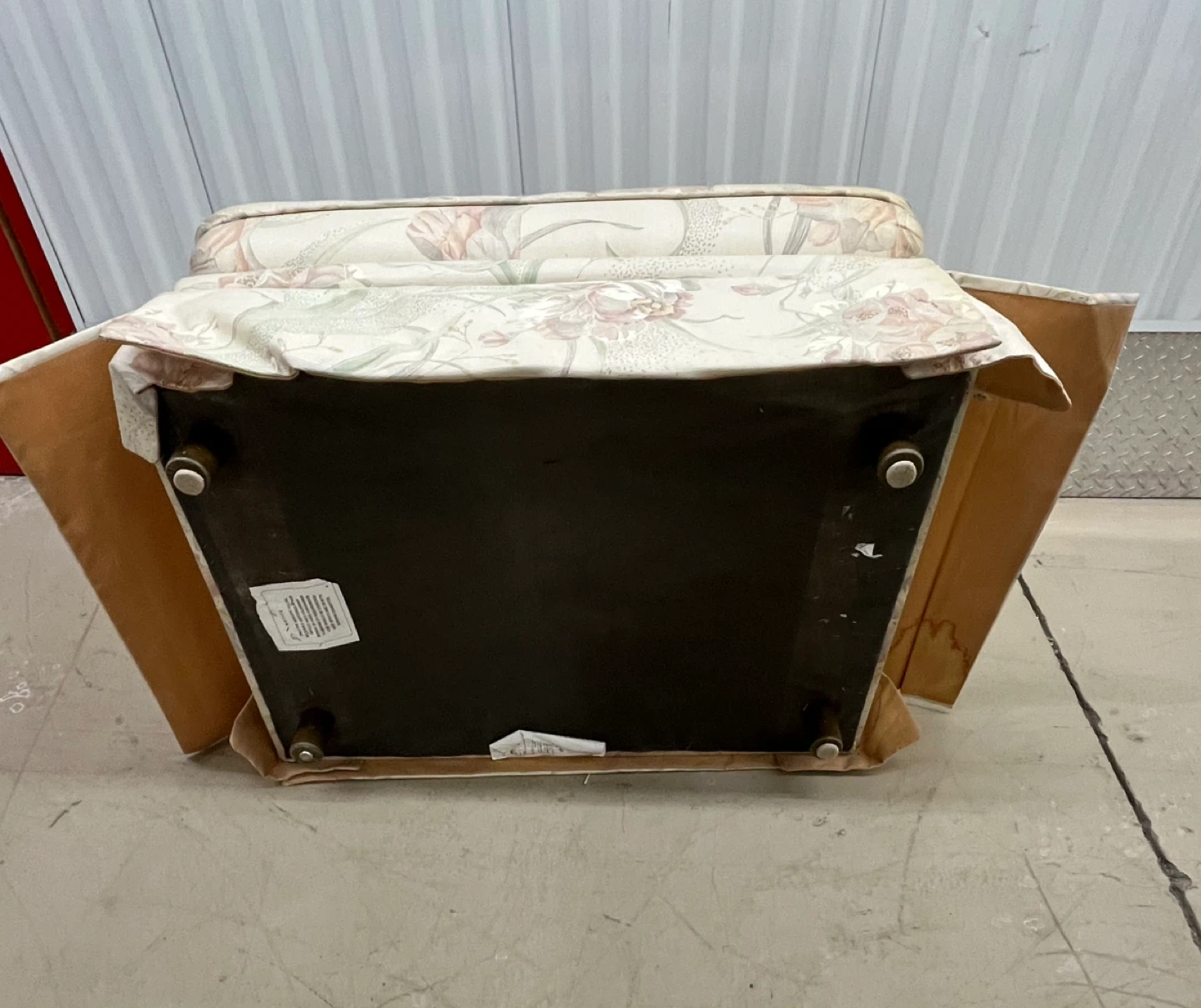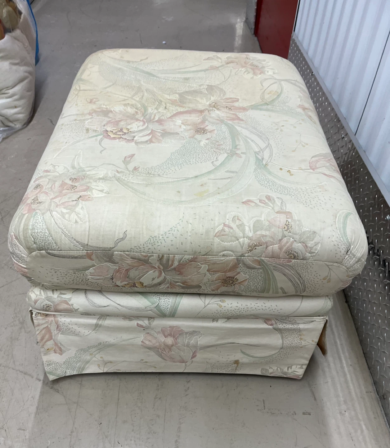 This upholstered ottoman features a pretty floral pattern. It's perfect for resting your feet after a long day. The skirted base adds a classic touch.