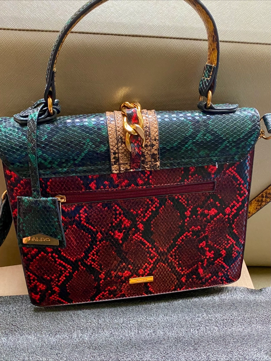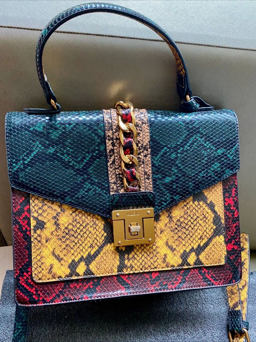 ALDO handbag with a snakeskin pattern. The bag is a mix of colours, with a gold clasp, chain, and other gold details