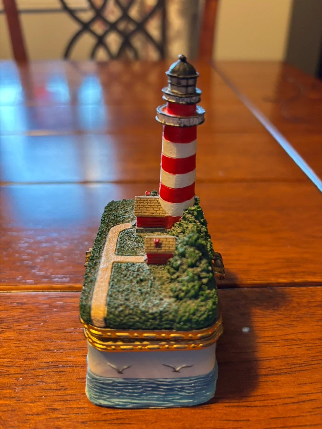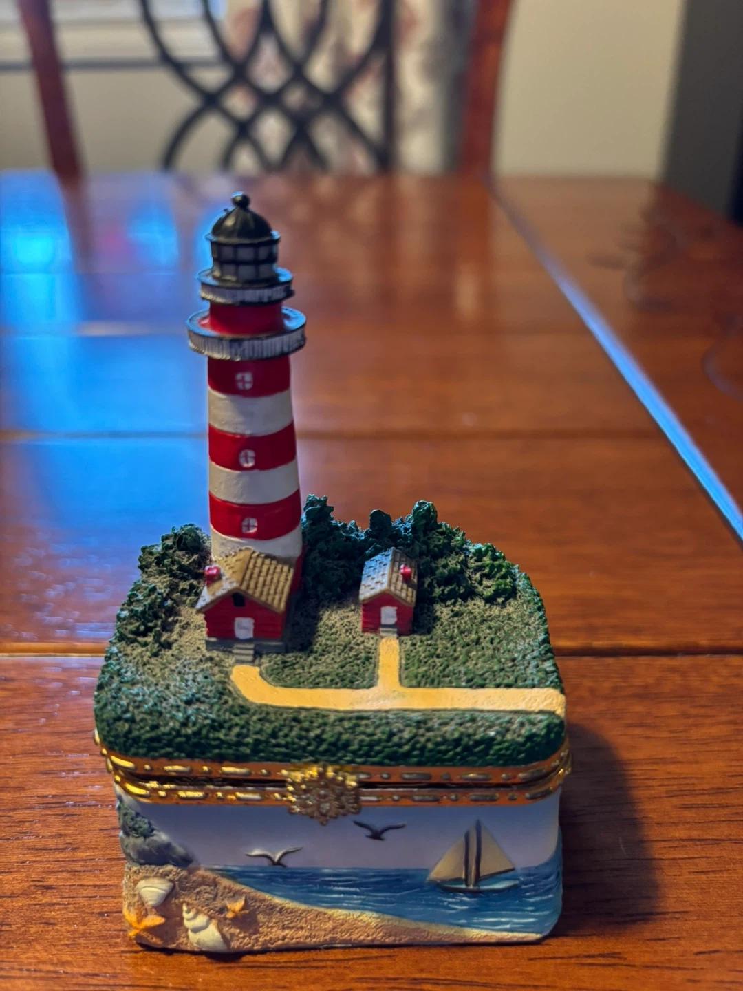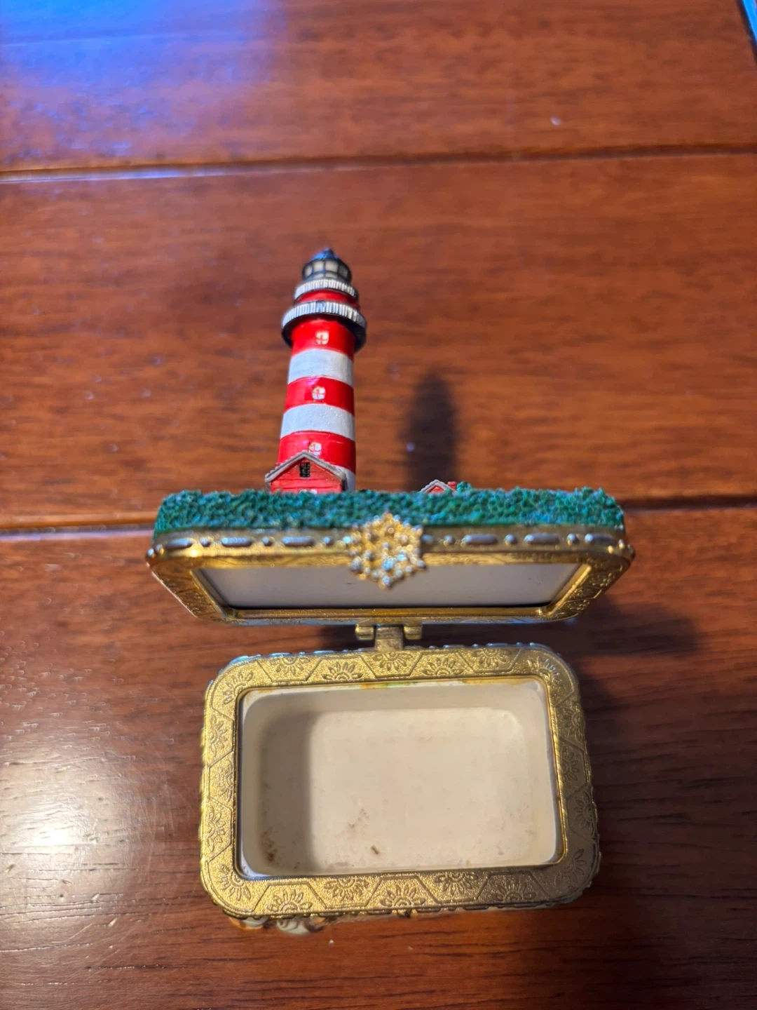 This decorative trinket box features a charming lighthouse scene on top. It's hinged for easy opening and has a colourful seaside depiction on the front. A lovely spot to keep small treasures!