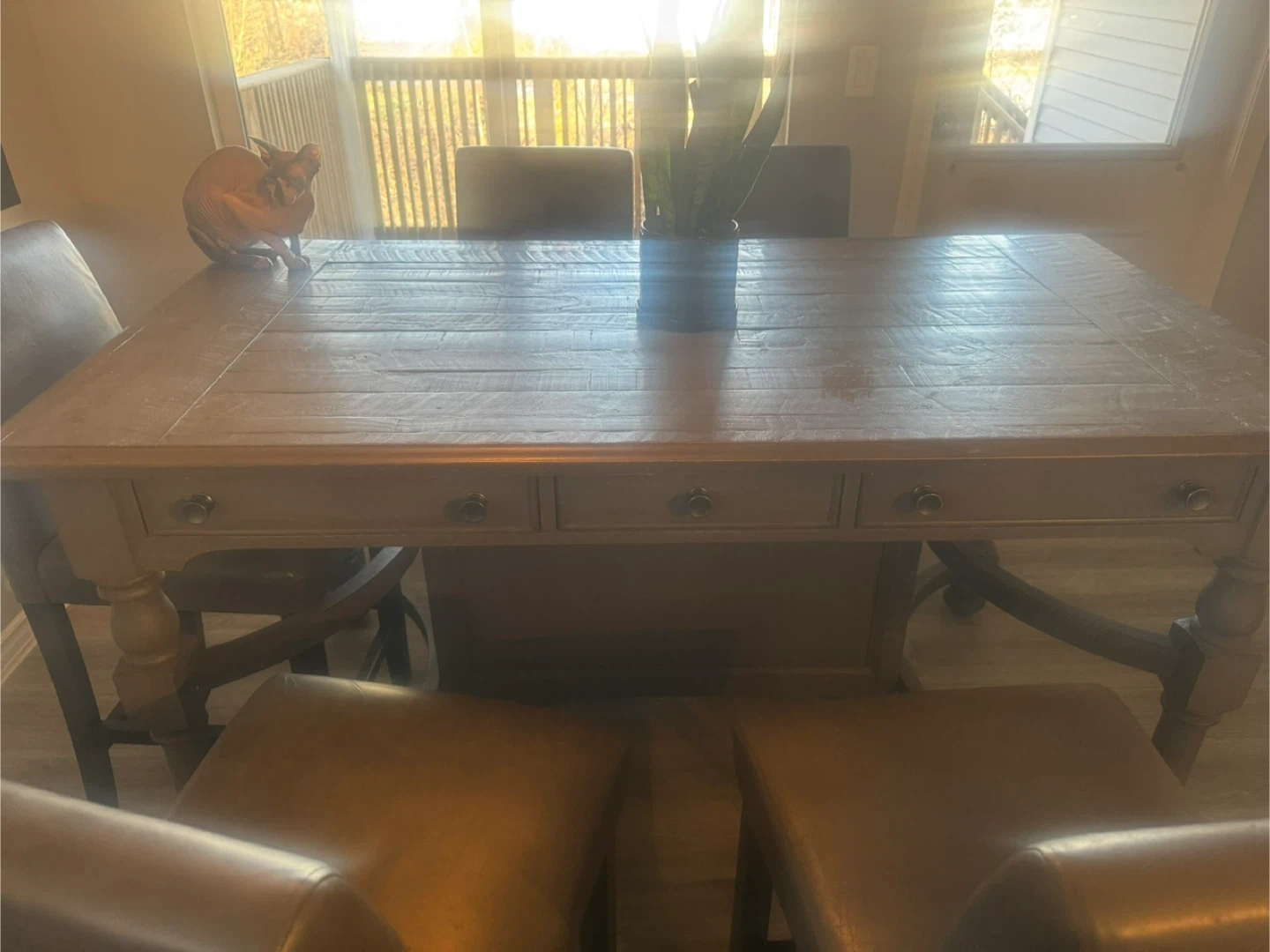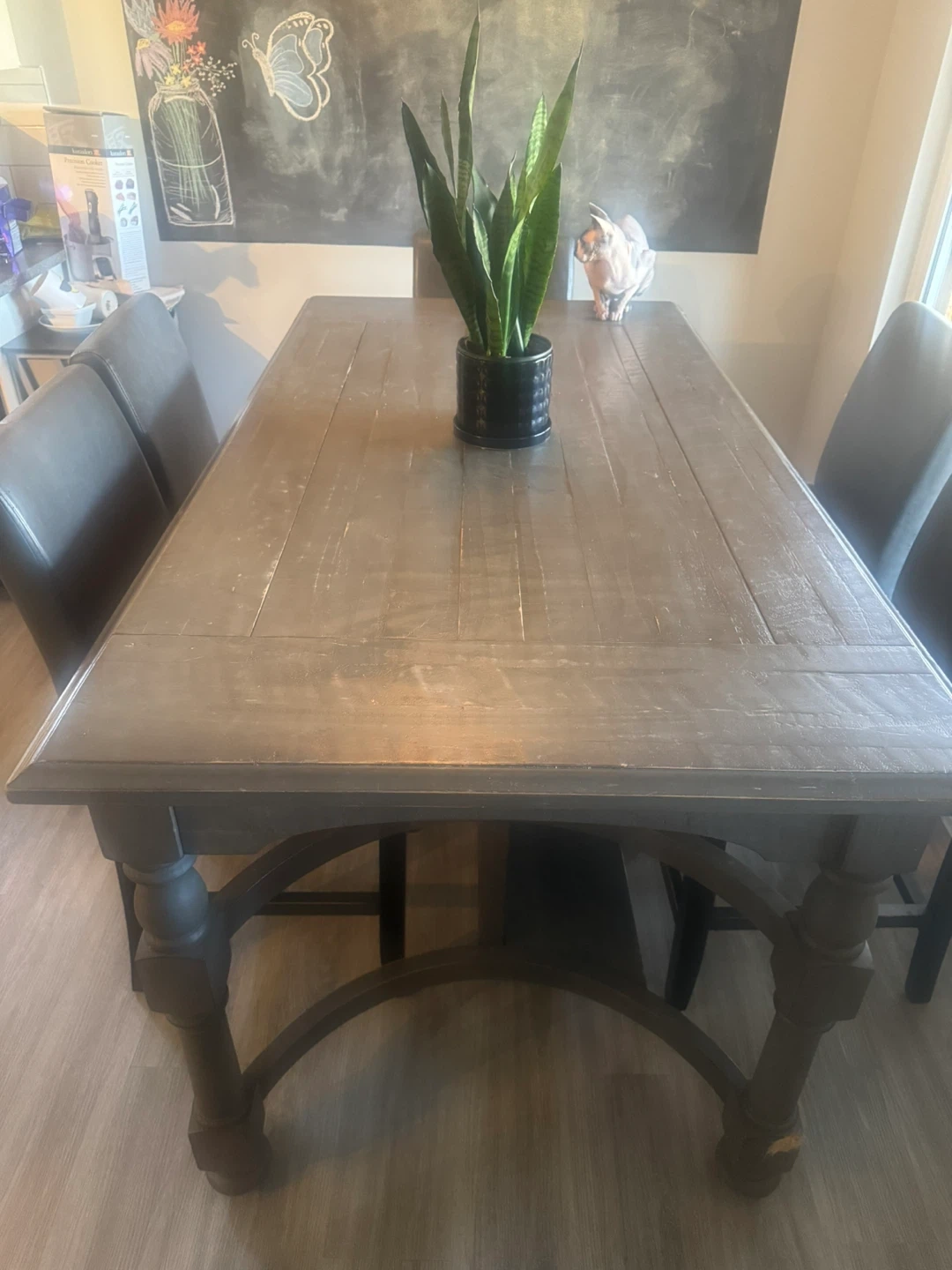 Rustic farmhouse dining table. Wood construction with a distressed grey finish. It has six drawers for extra storage. Seats six people comfortably.