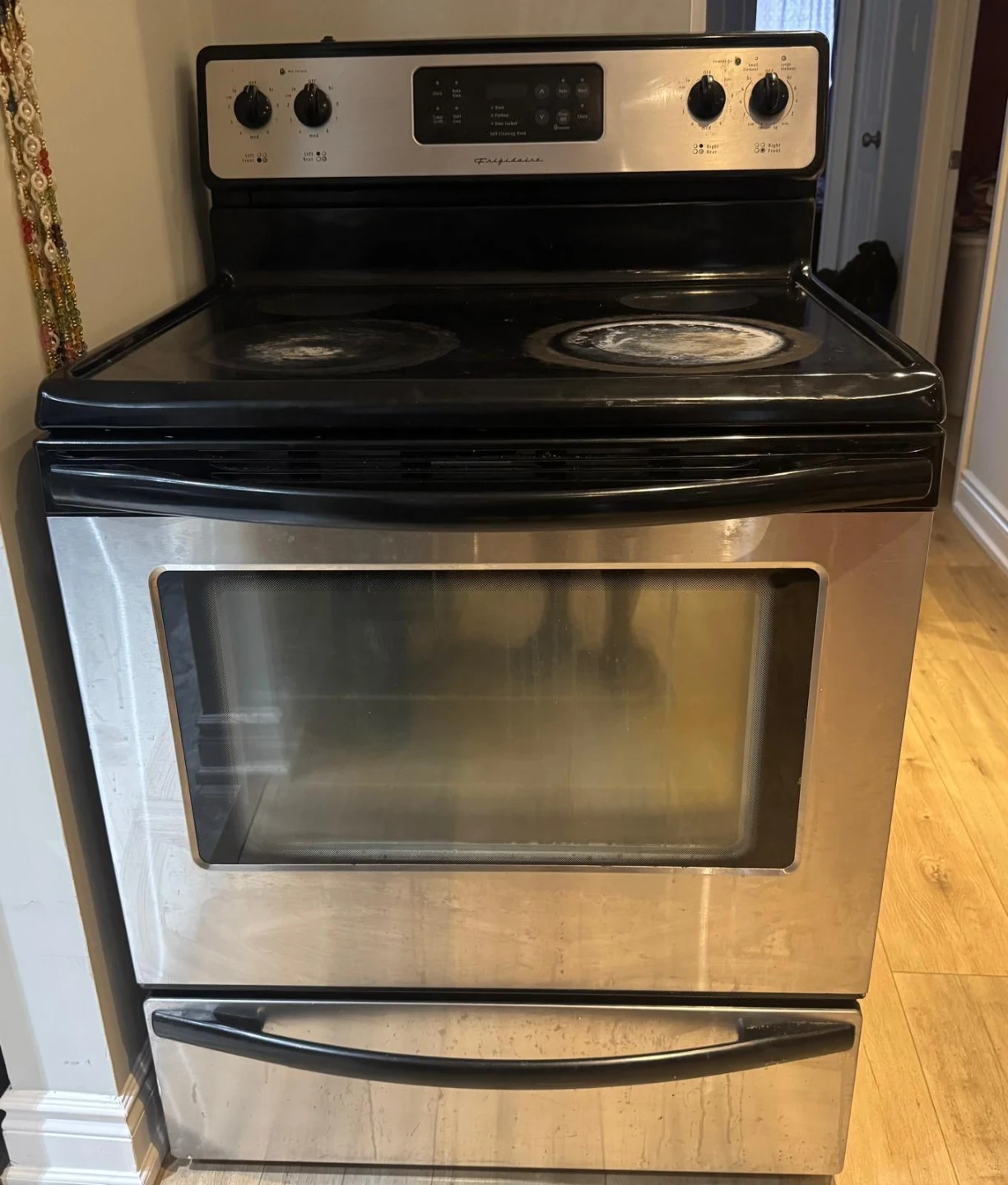 This is a Frigidaire electric stove with a smooth top and oven. It has four burner elements on the cooktop and a storage drawer at the bottom. Perfect for everyday cooking needs in your kitchen!